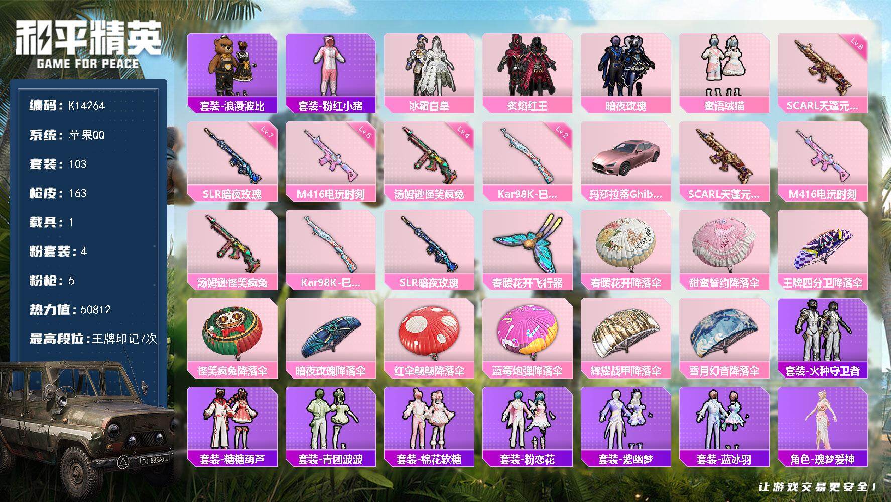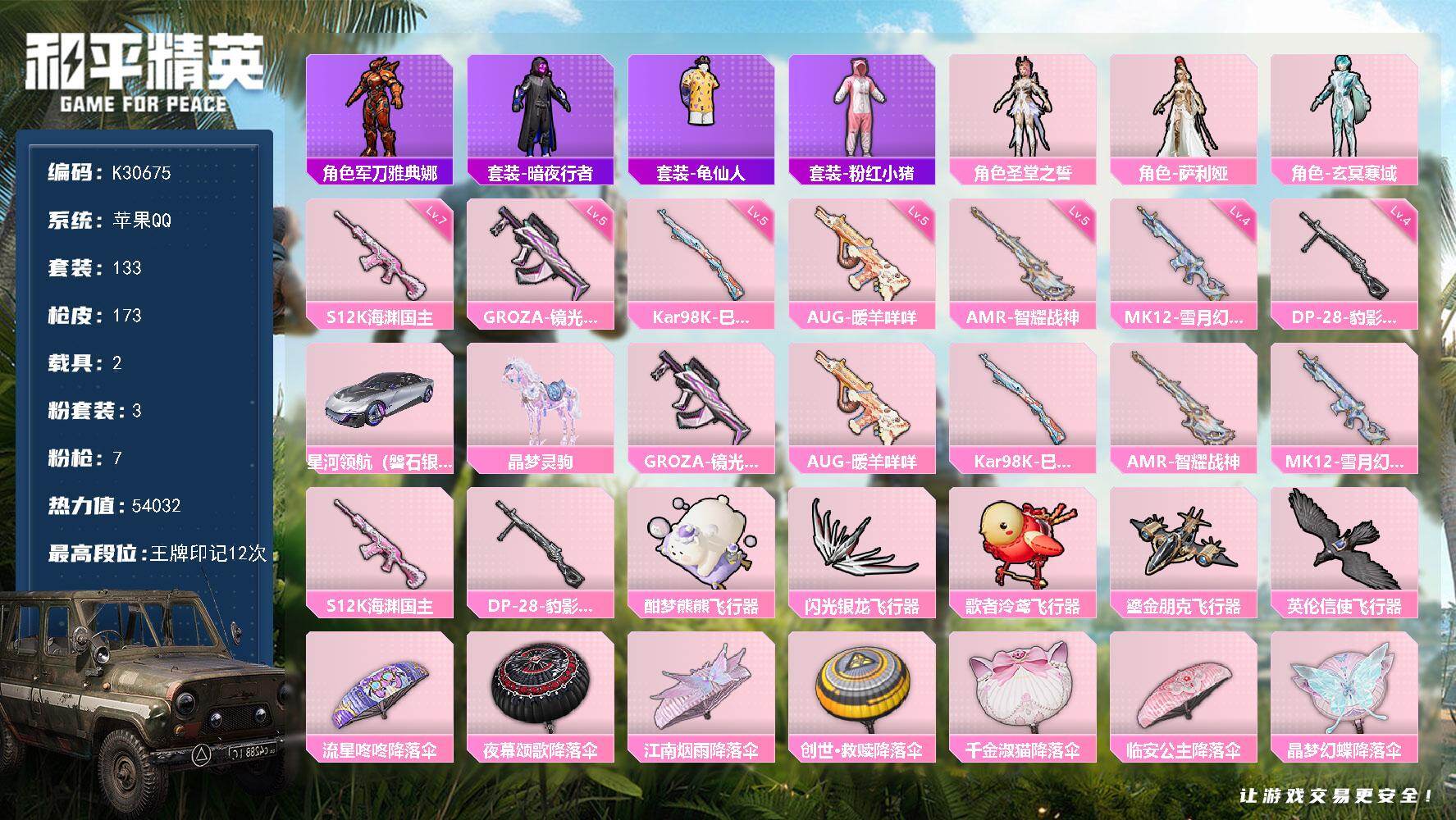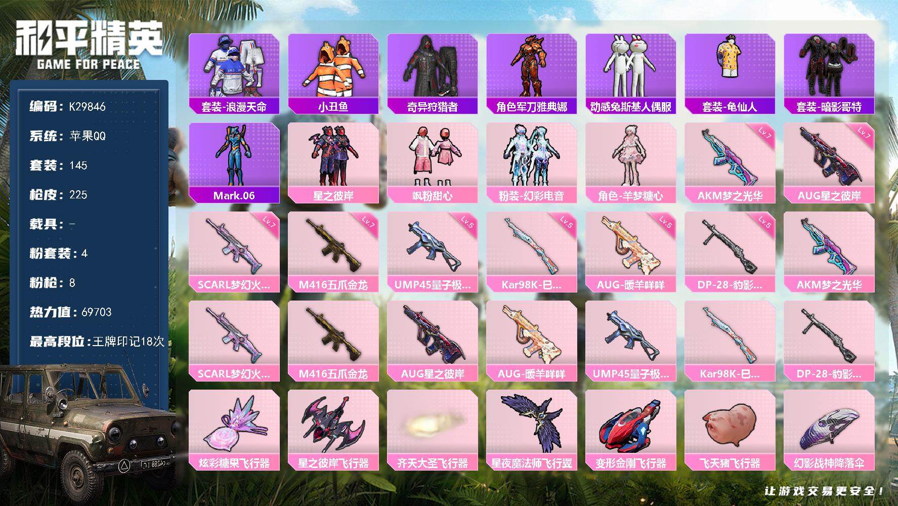 苹果 手Q-4粉装-8特效枪-0载具-7粉色飞行器-69703热力值-18王牌印
