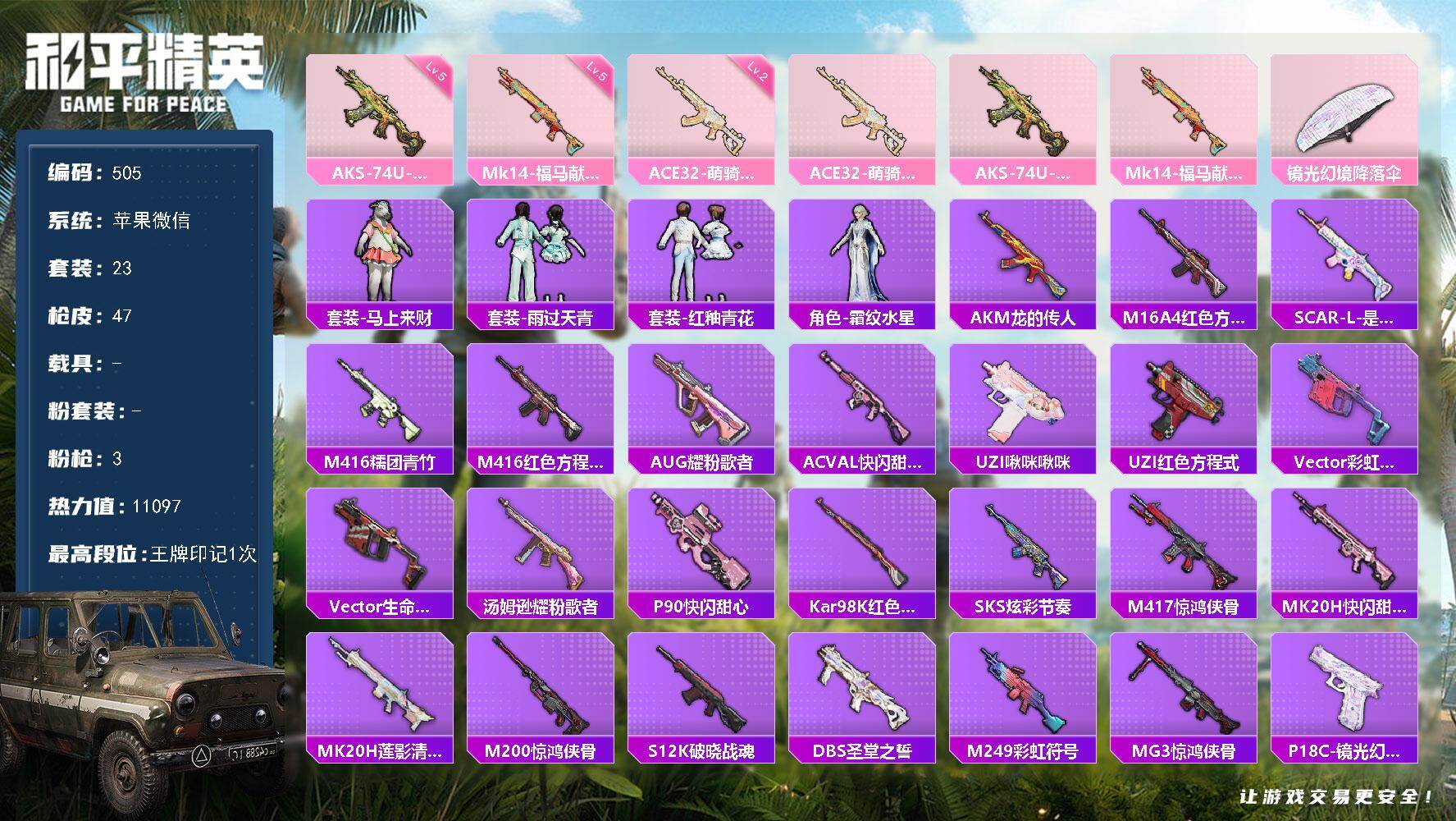 苹果 微信-0粉装-3特效枪-0载具-0粉色飞行器-11097热力值-1王牌印