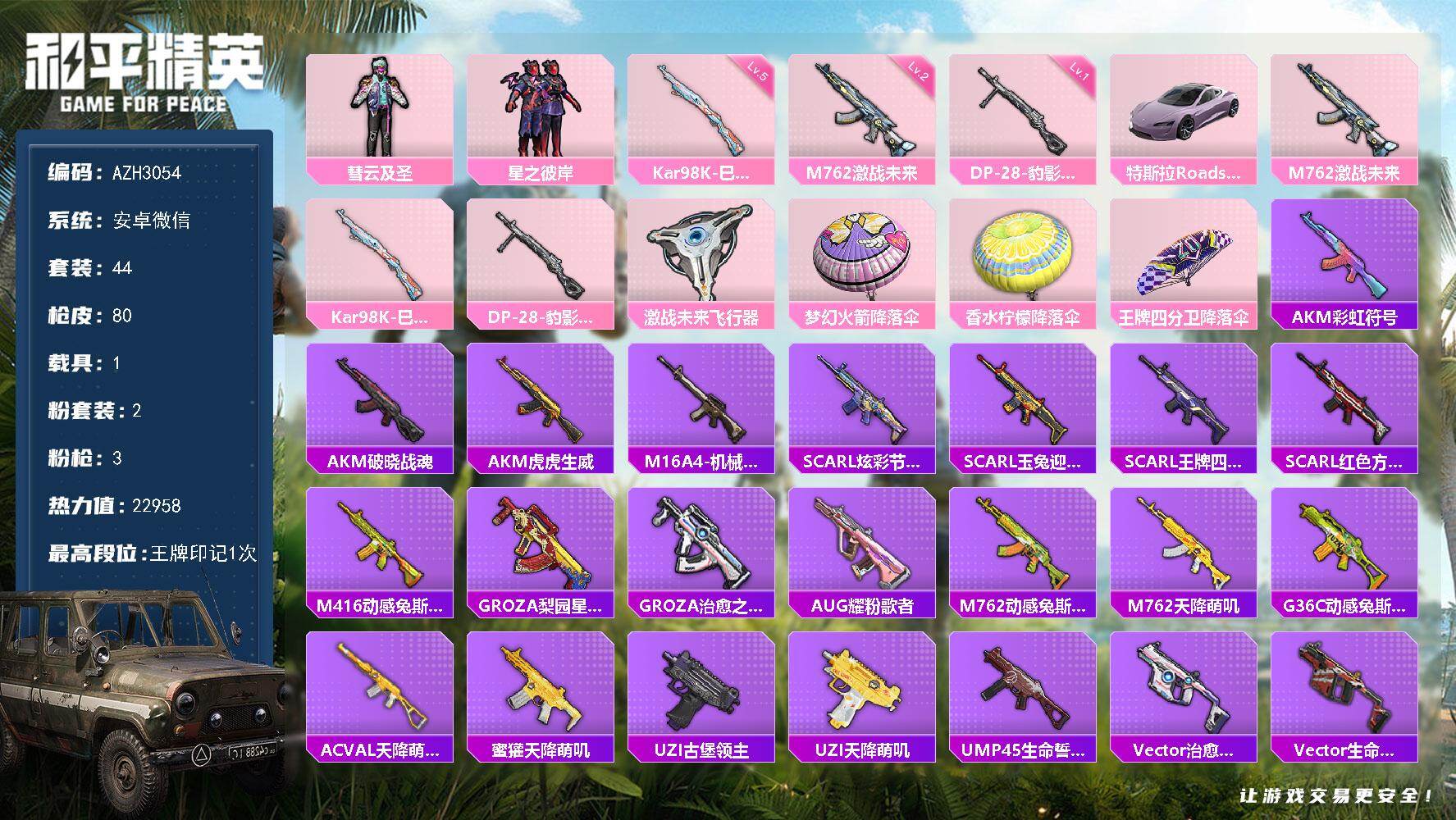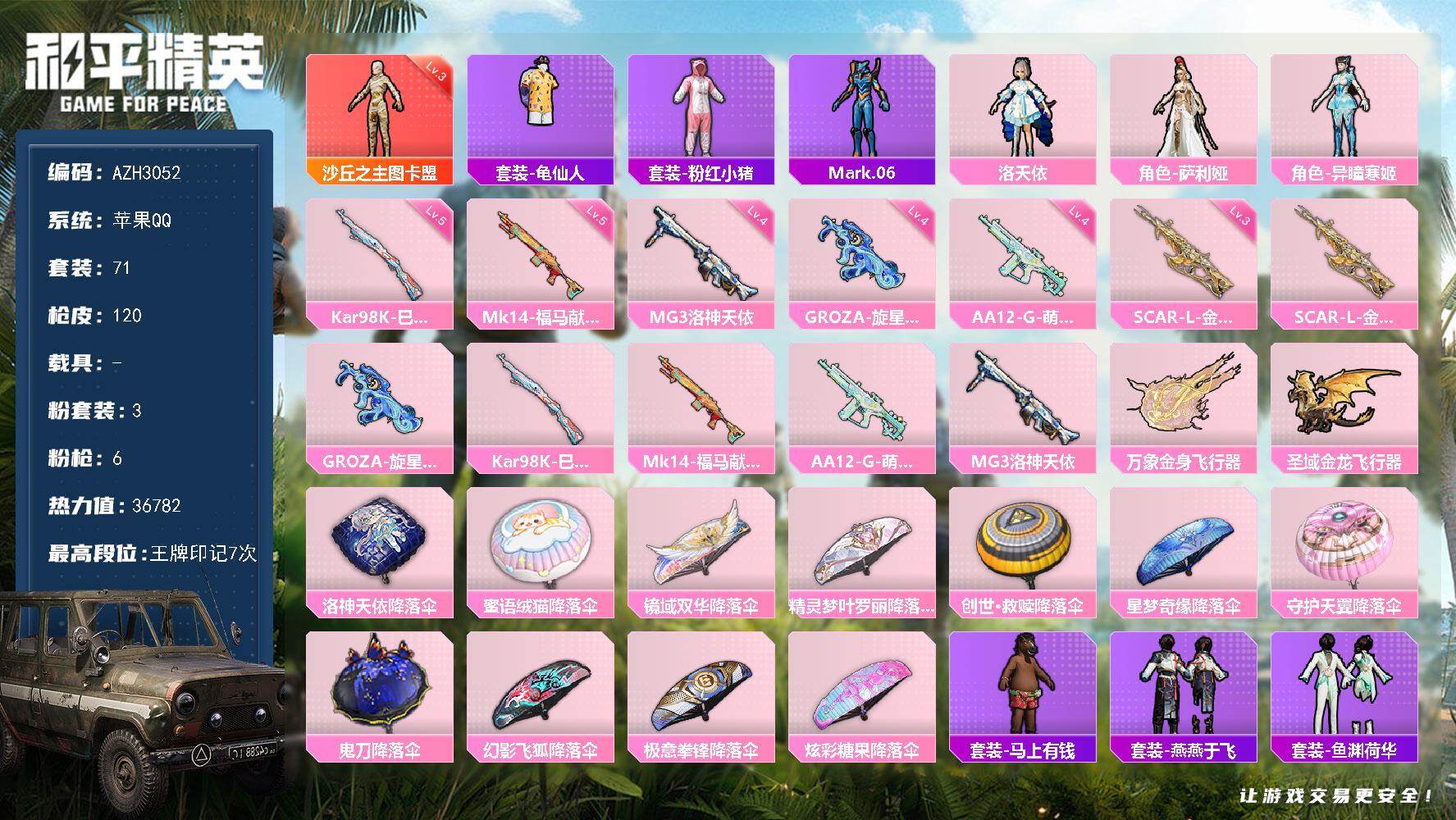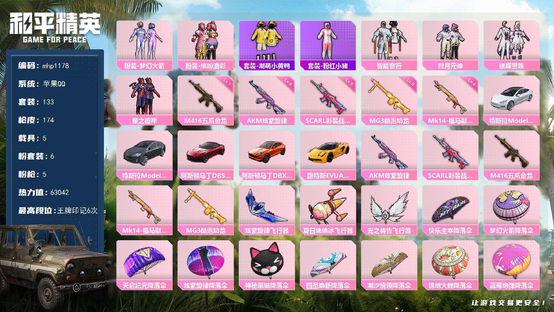 苹果 手Q-7粉装-6特效枪-2载具-2粉色飞行器-47990热力值-11王牌