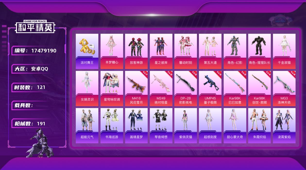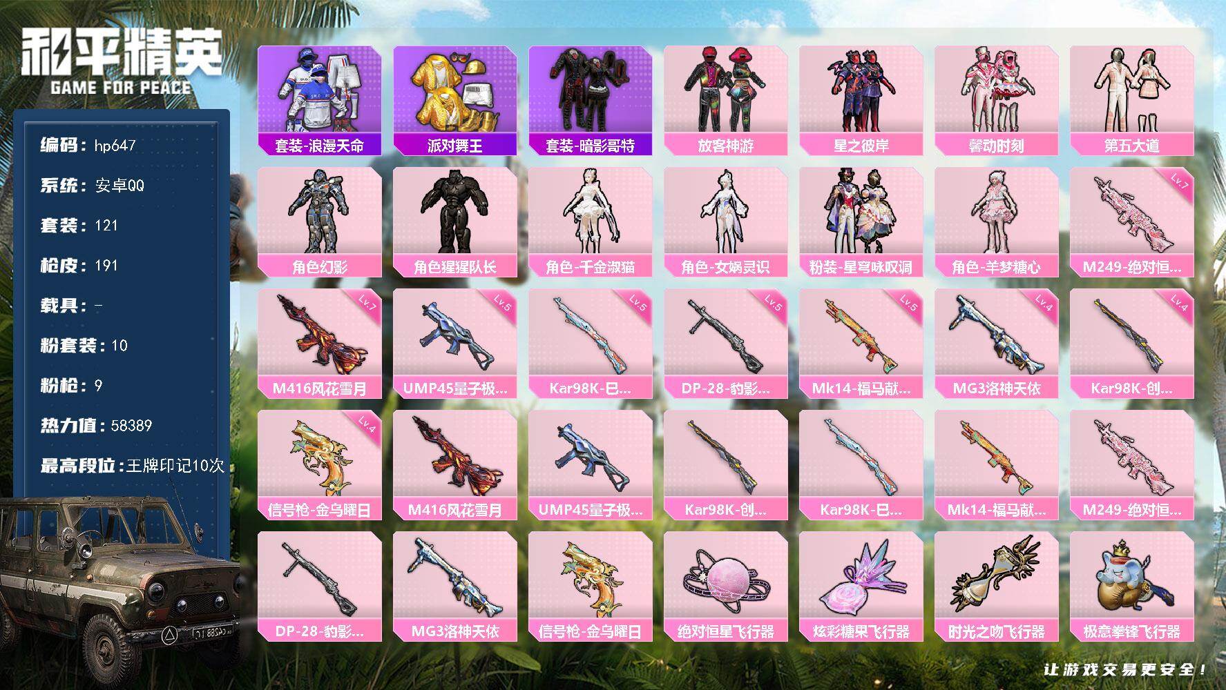 10粉装-9特效枪-0载具-5粉色飞行器-58389热力值-10王牌印记-121套装-191枪皮