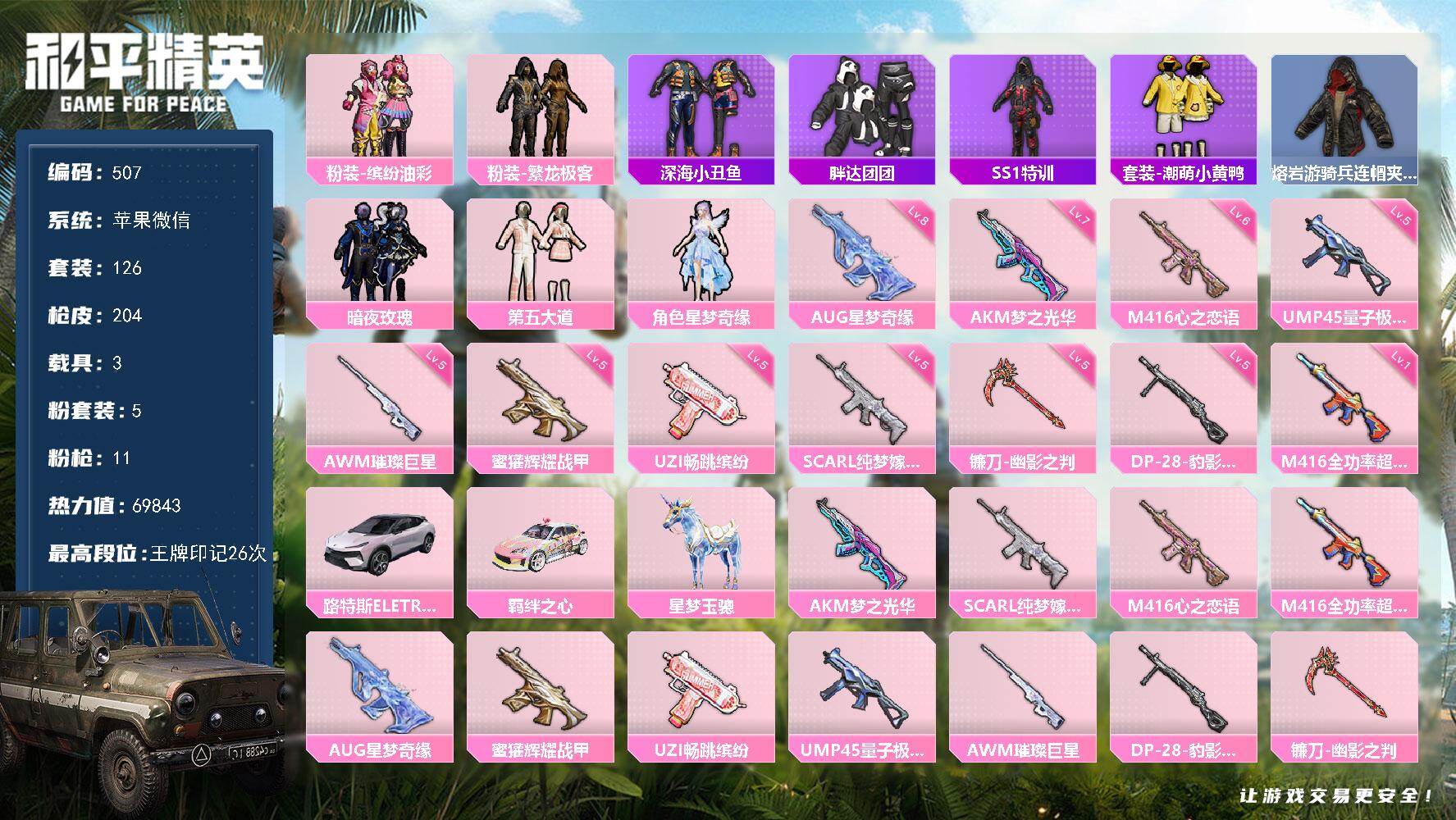 苹果 微信-5粉装-11特效枪-3载具-3粉色飞行器-69843热力值-26王