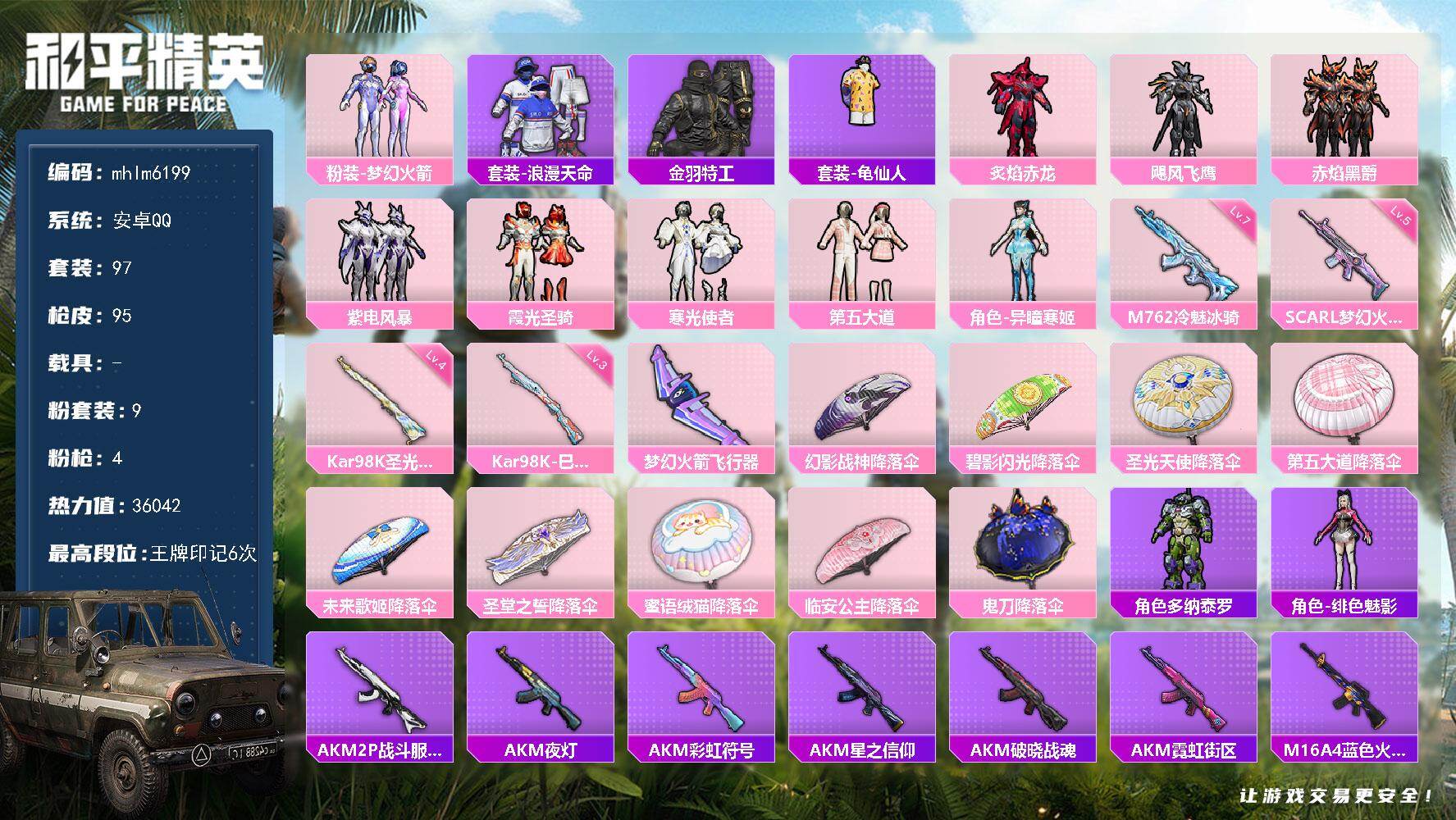 【mhlm6175】安卓 手Q-1神装-25粉装-6特效枪-2载具-10粉色飞