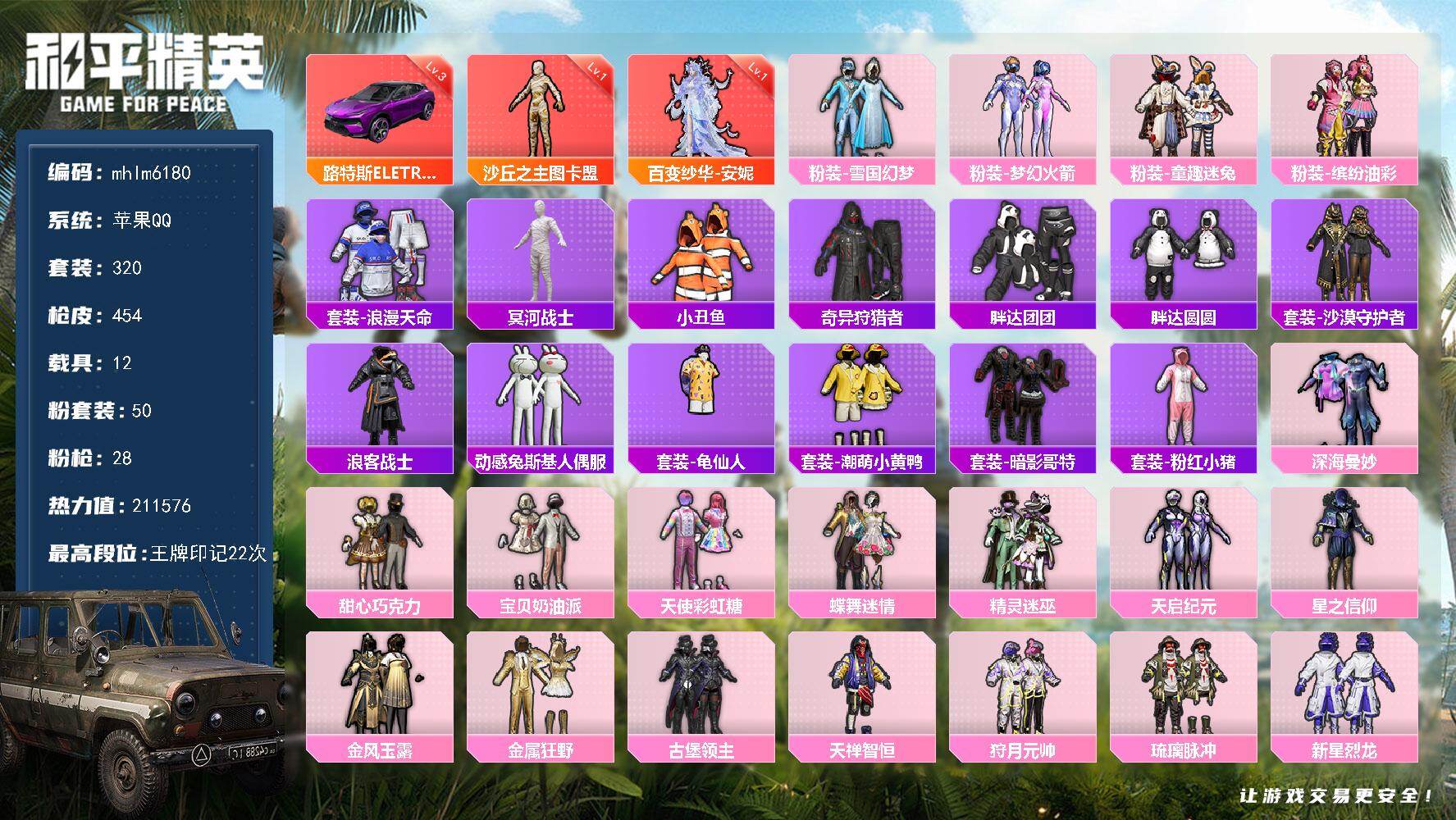 【mhlm6180】苹果 手Q-2神装-50粉装-28特效枪-12载具-22粉