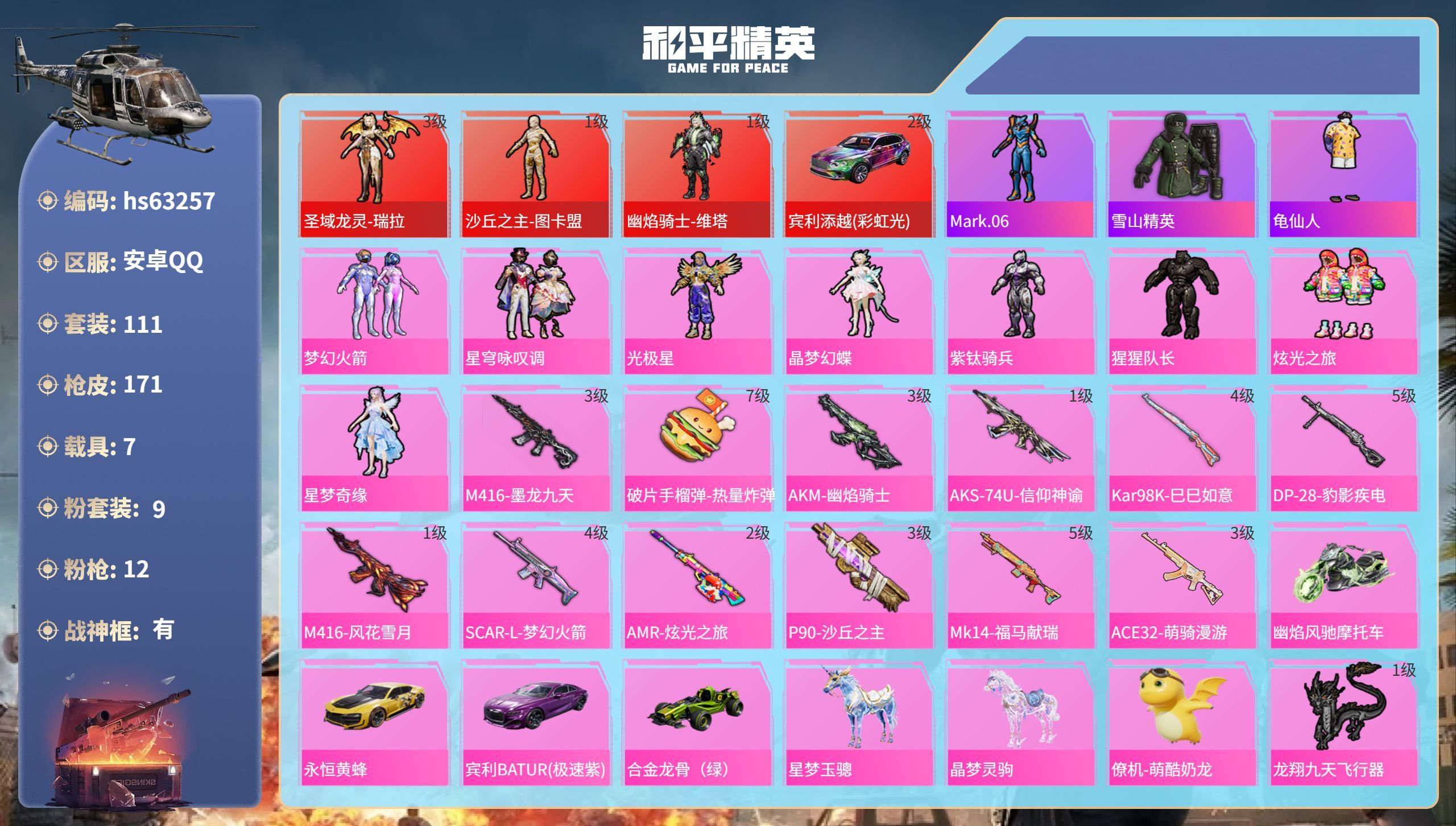 hs63257 安卓手Q-14王牌印记-有战神框-3红装-9粉装-12特效枪-7载具-70557热力