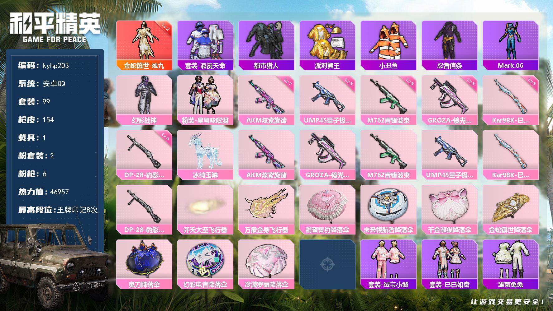 1神装-2粉装-6特效枪-1载具-3粉色飞行器-46957热力值-8王牌印记-99套装-154枪皮