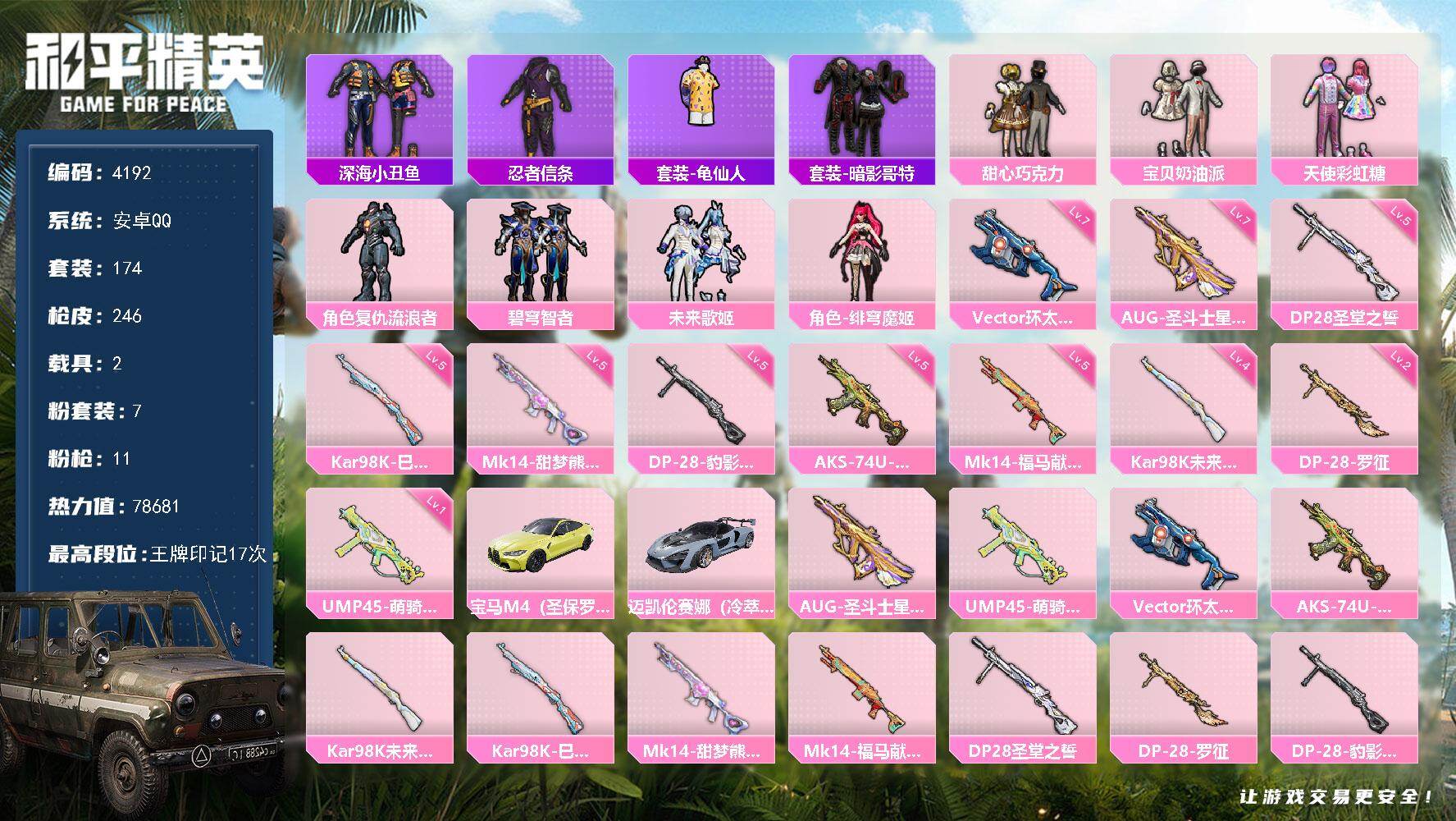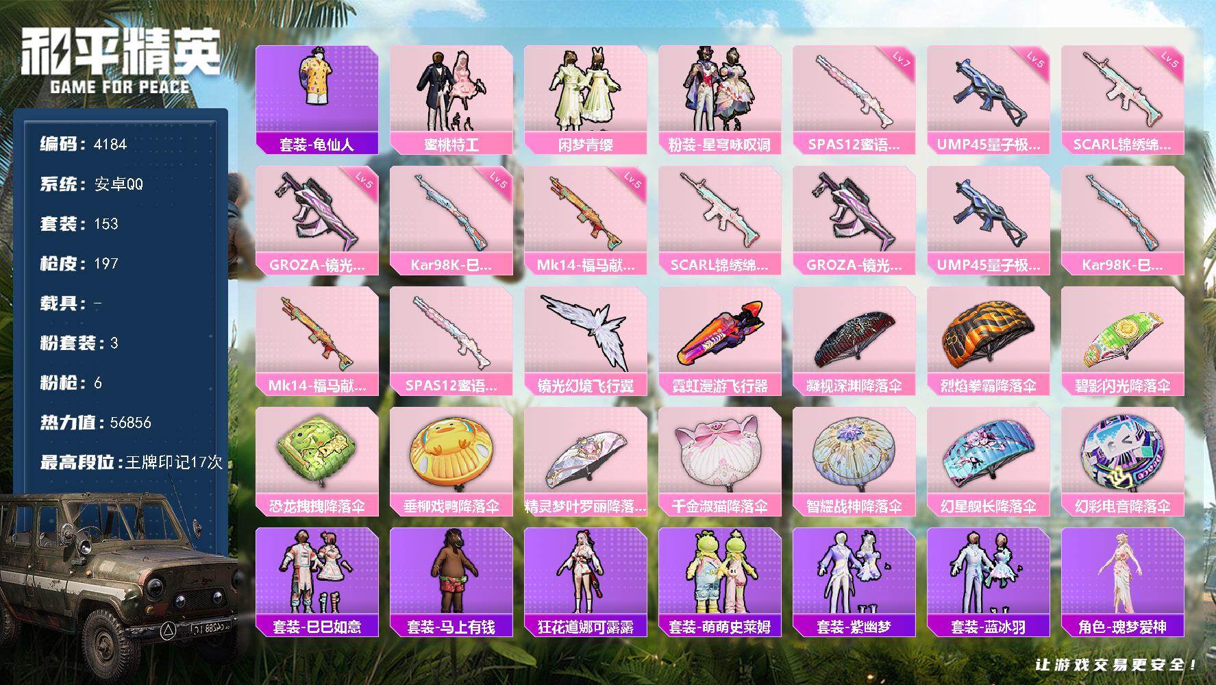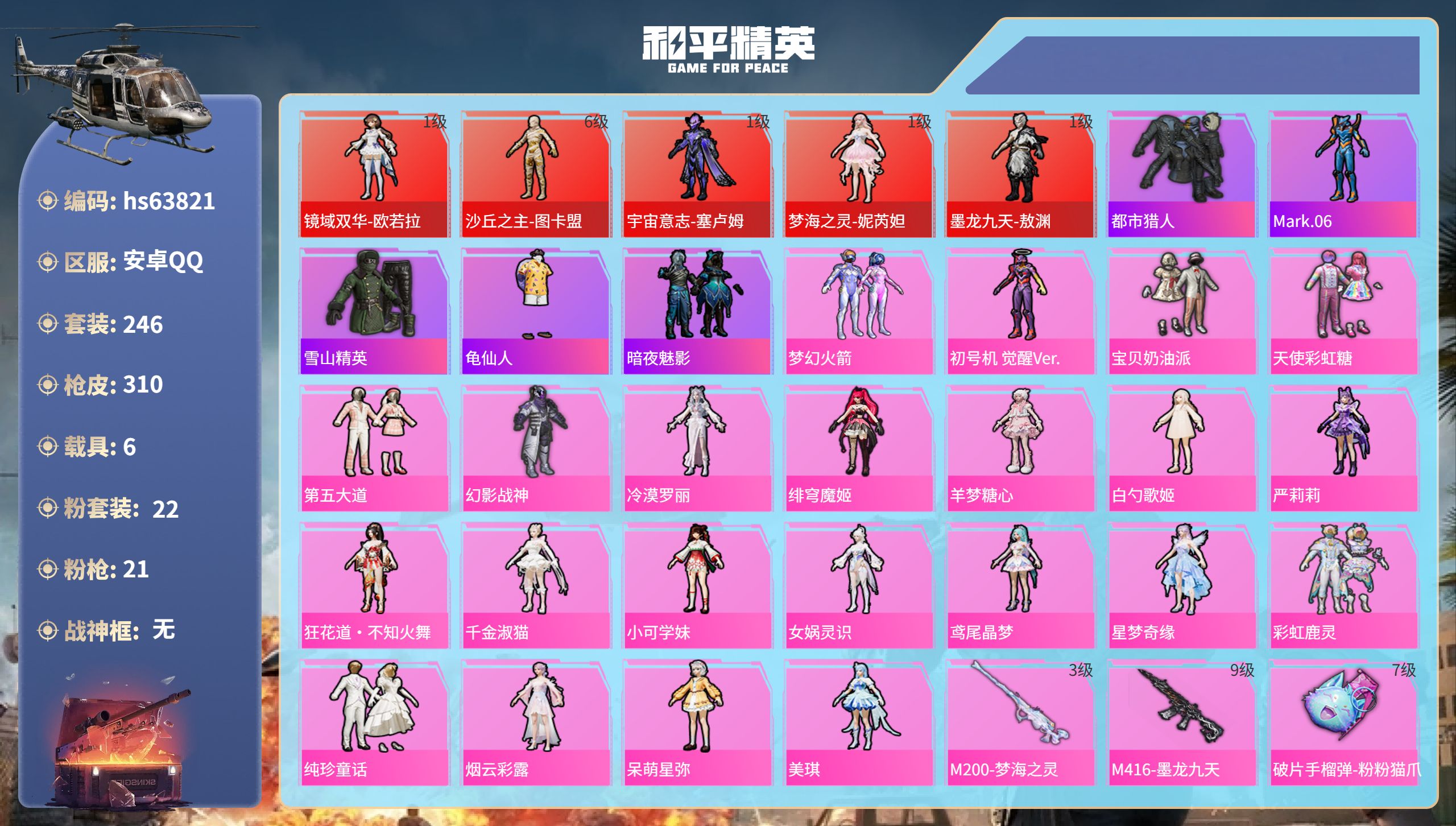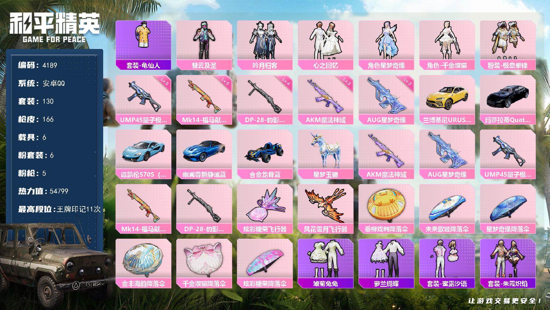 6粉装-5特效枪-6载具-2粉色飞行器-54799热力值-11王牌印记-130套装-166枪皮