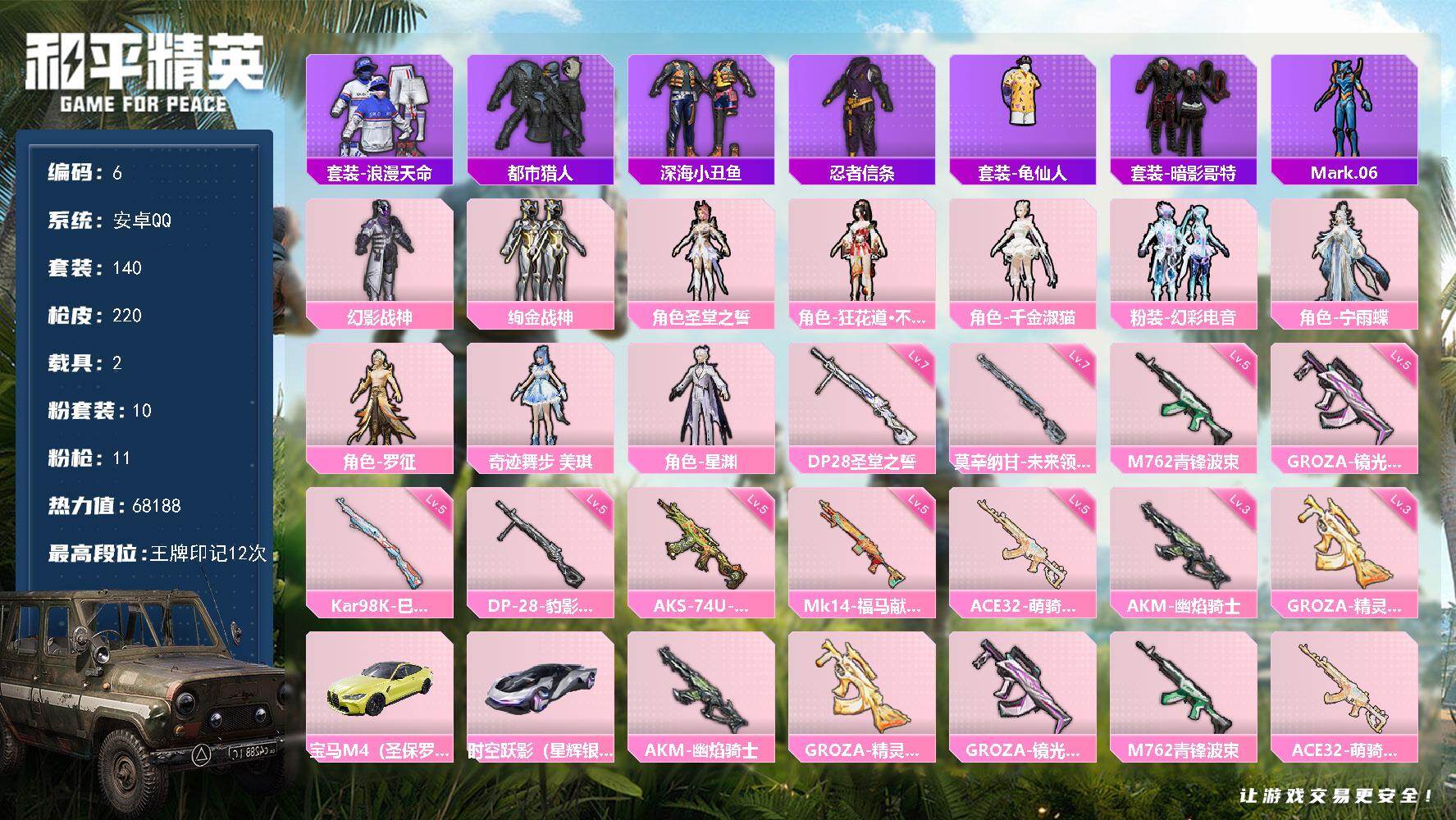 10粉装-11特效枪-2载具-6粉色飞行器-68188热力值-12王牌印记-140套装-220枪皮