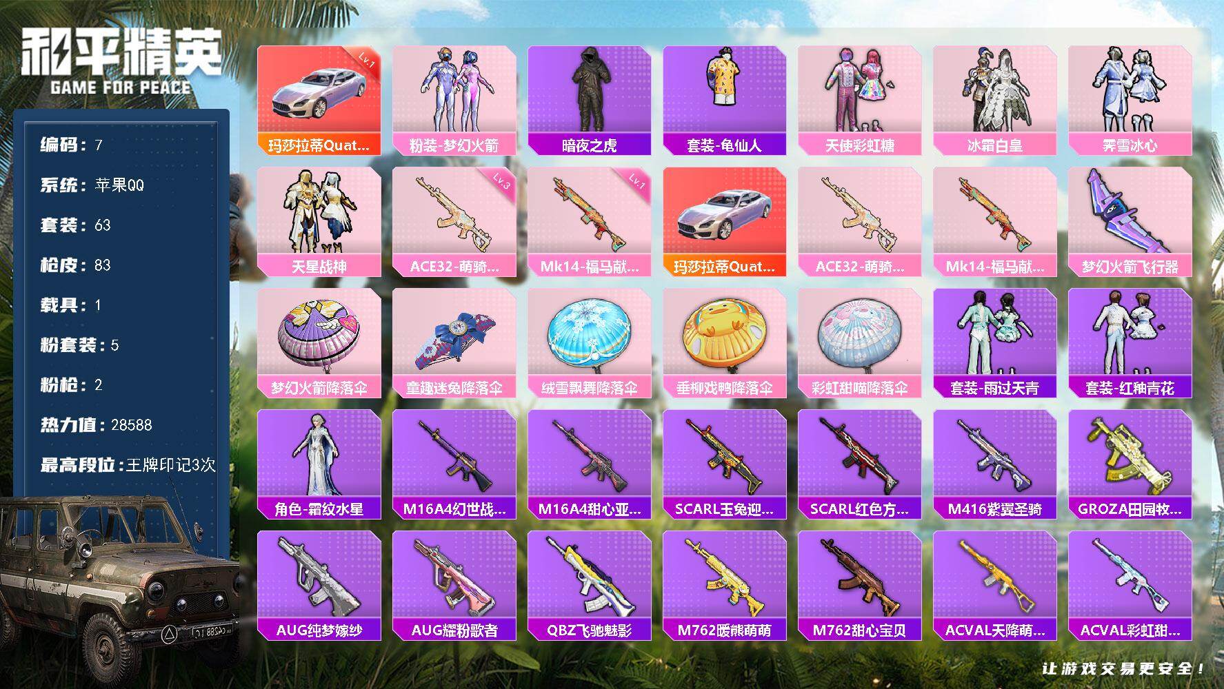 5粉装-2特效枪-1载具-1粉色飞行器-28588热力值-3王牌印记-63套装-83枪皮