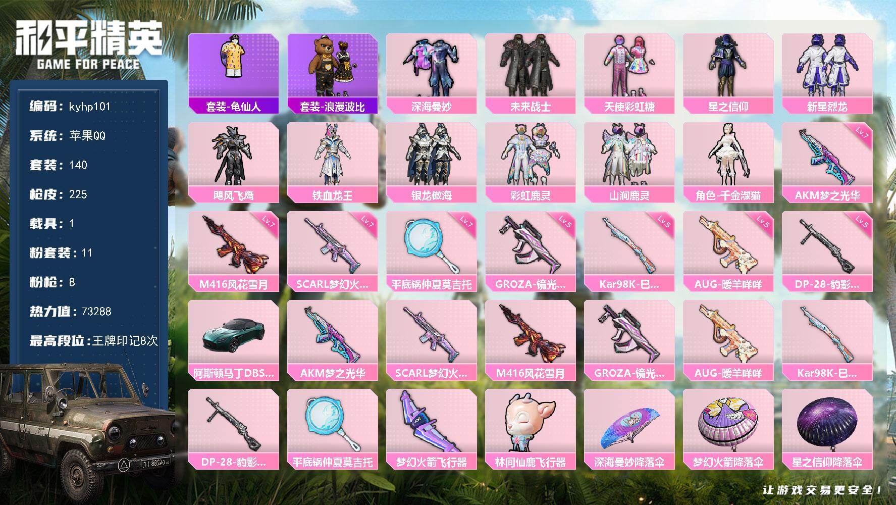 苹果 手Q-11粉装-8特效枪-1载具-4粉色飞行器-73288热力值-8王牌