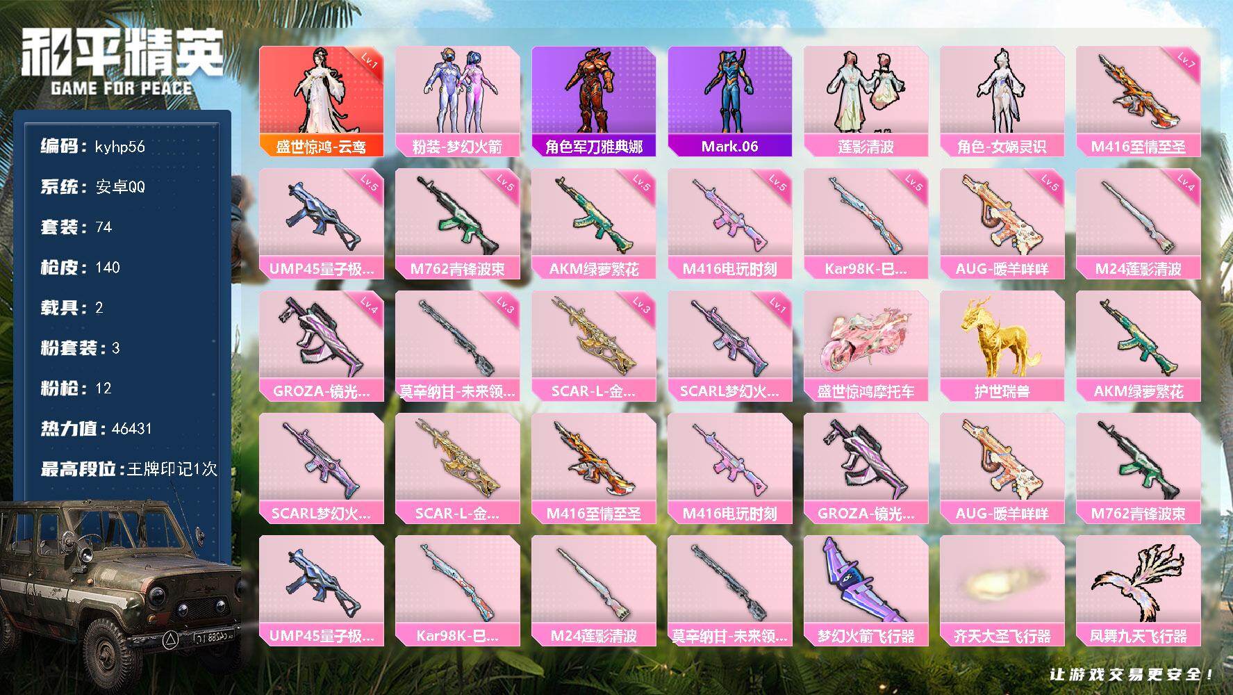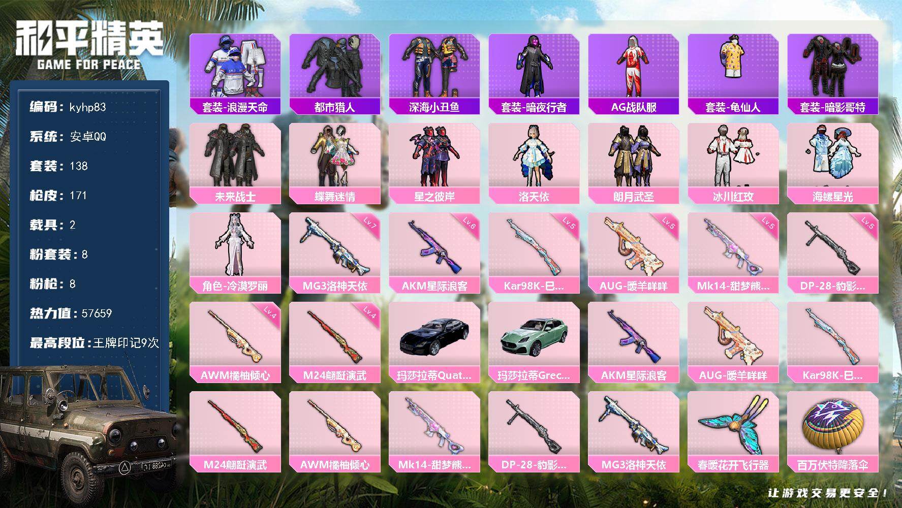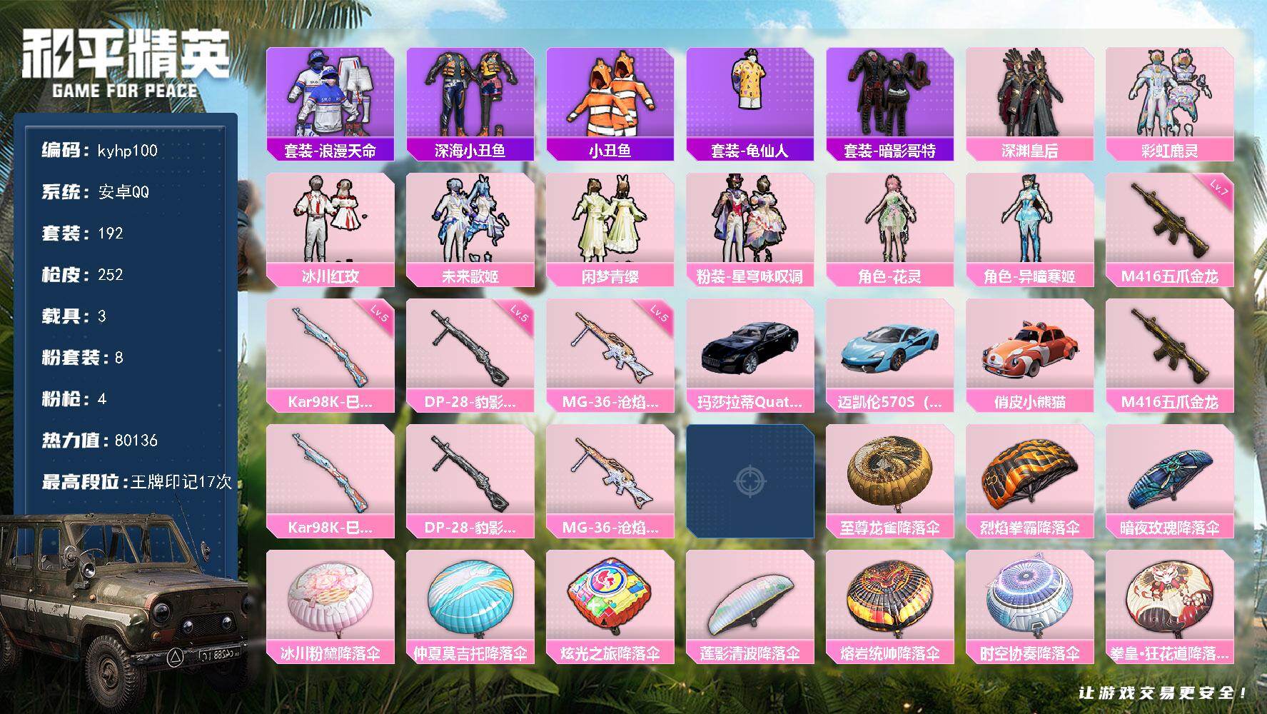 安卓 手Q-8粉装-4特效枪-3载具-2粉色飞行器-80136热力值-17王牌