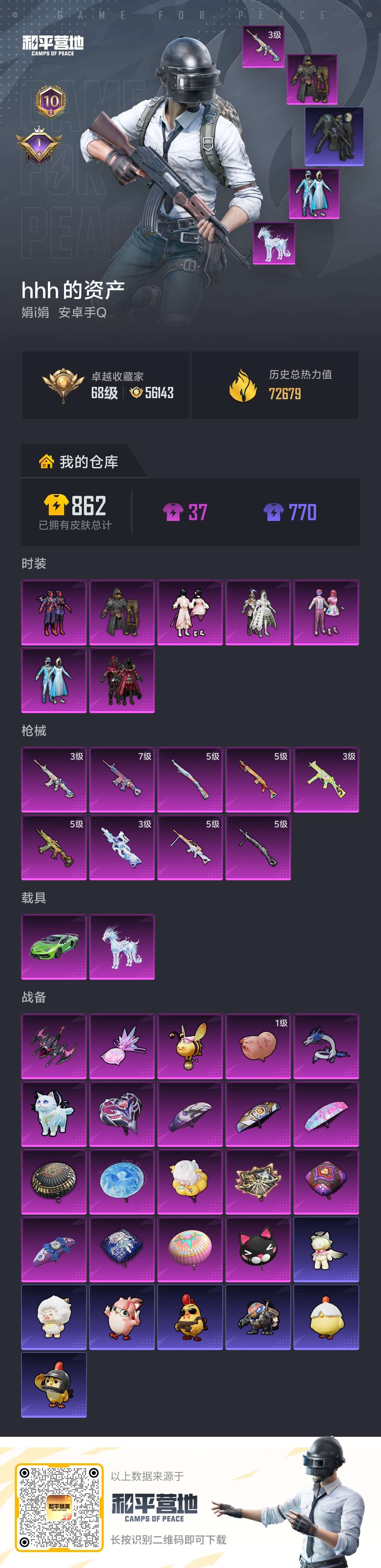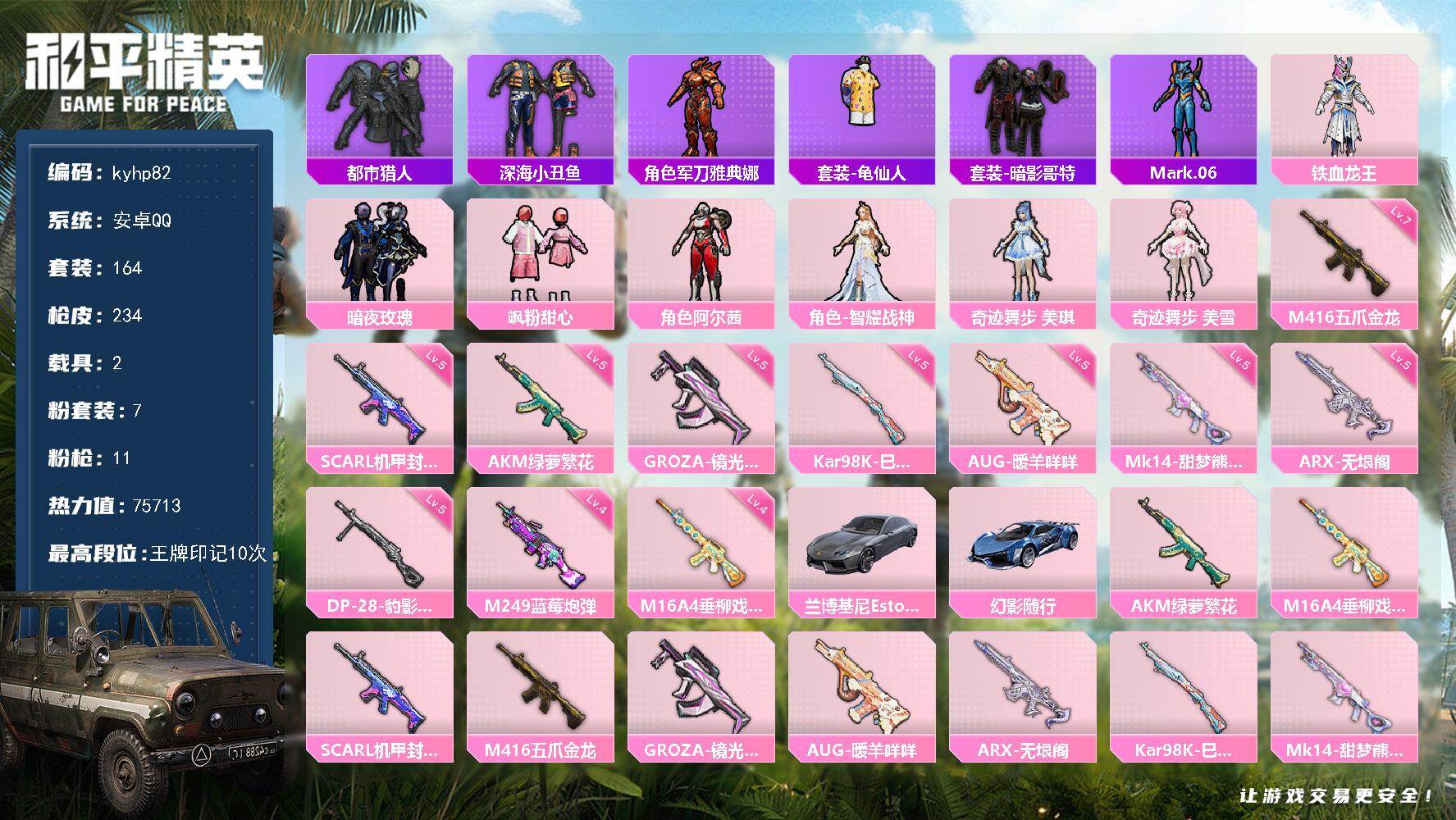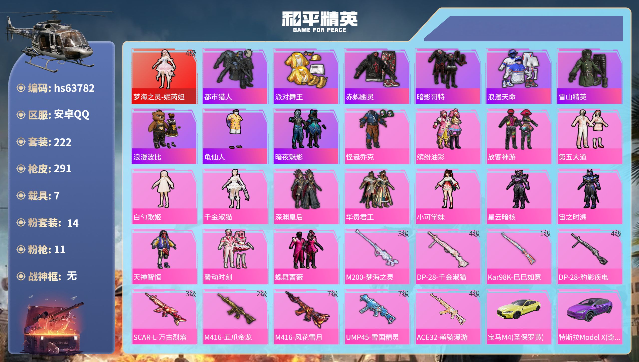 安卓 手Q-8粉装-4特效枪-3载具-2粉色飞行器-80136热力值-17王牌