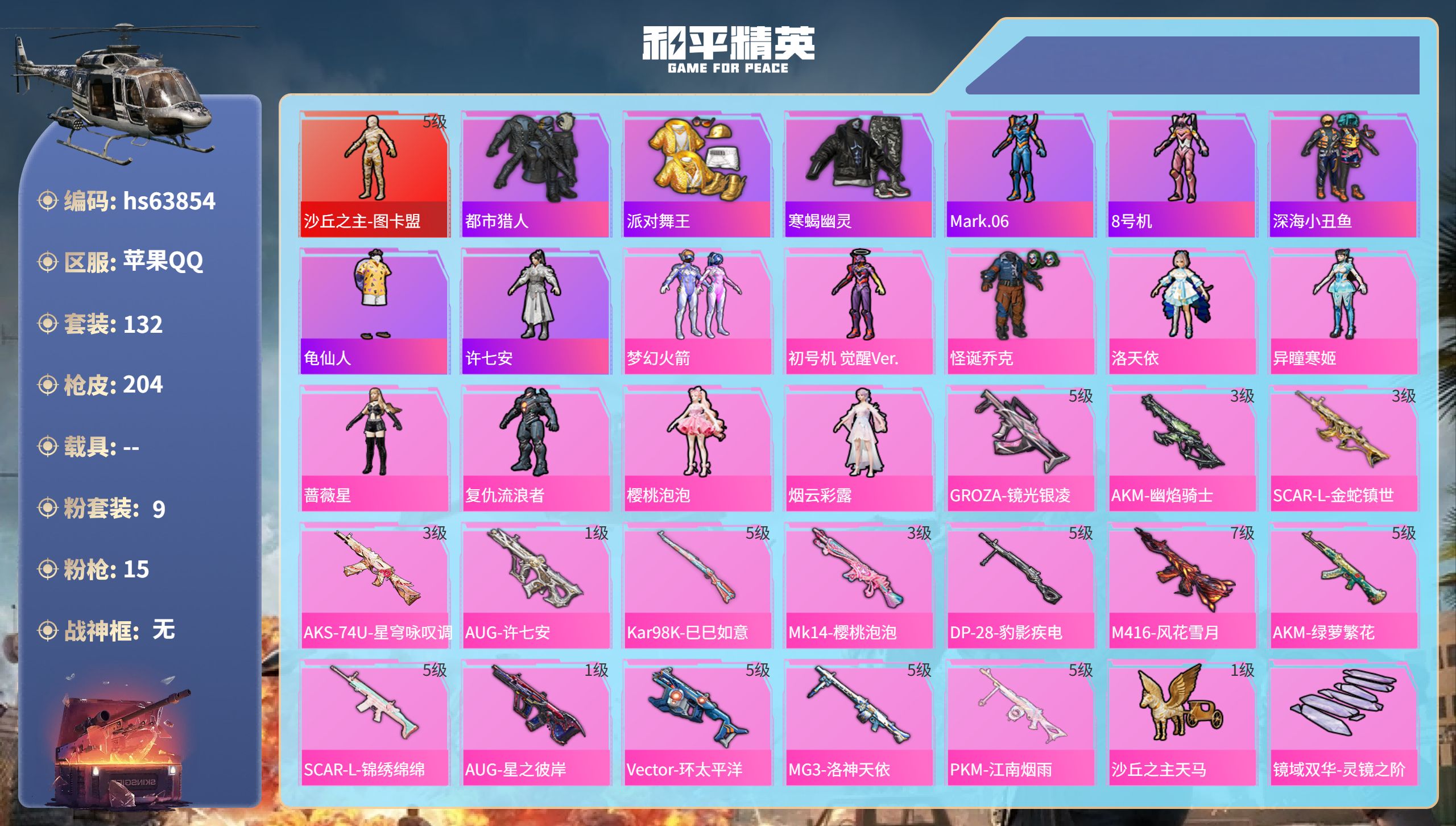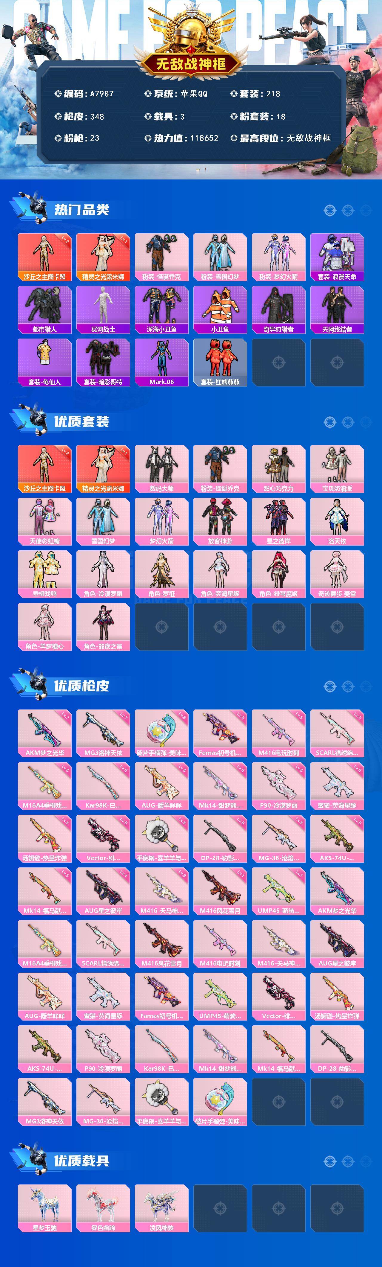 无敌战神框-2神装-18粉装-23特效枪-3载具-11粉色飞行器-118652热力值-16王牌印记-218套装