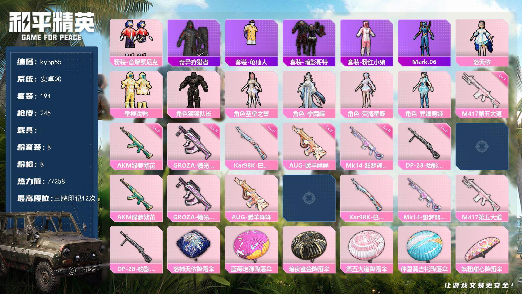 安卓 手Q-8粉装-8特效枪-0载具-1粉色飞行器-77258热力值-12王牌