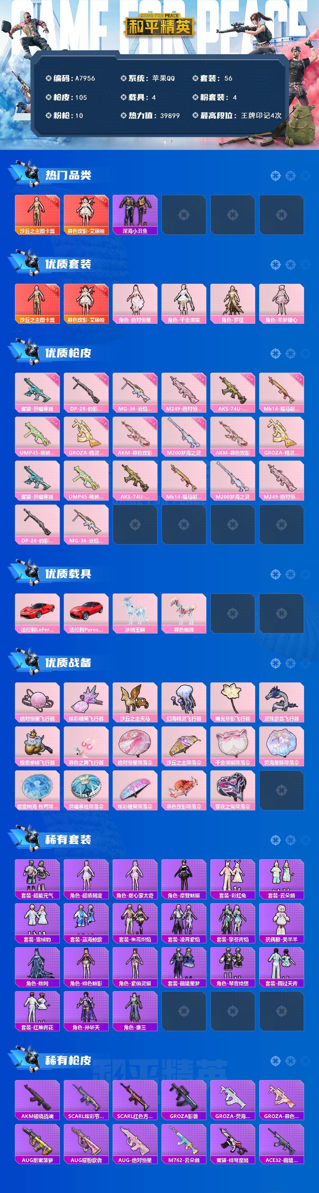 2神装-4粉装-10特效枪-4载具-8粉色飞行器-39899热力值-4王牌印记-56套装-105枪皮