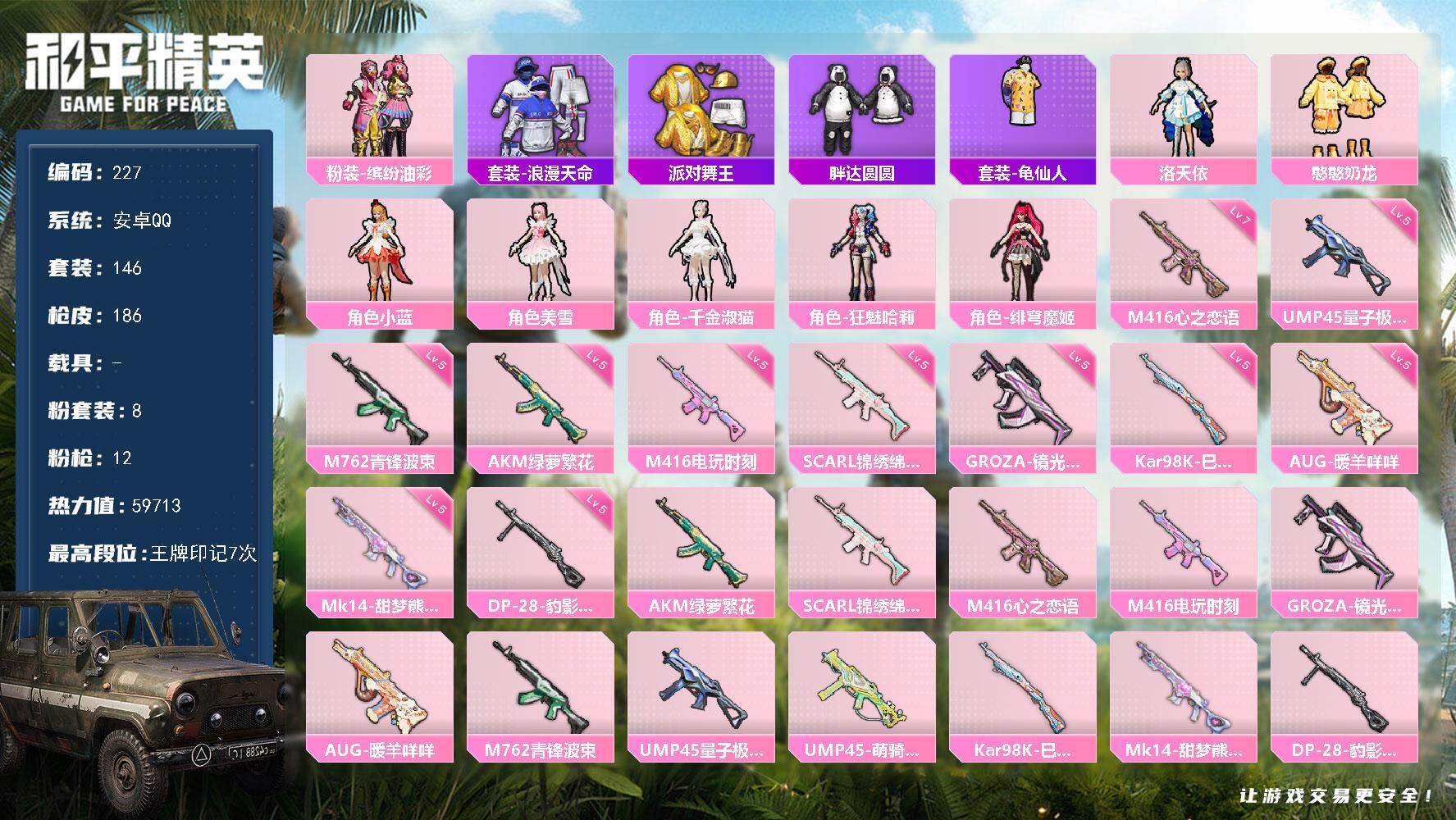 8粉装-12特效枪-146套装-186枪皮-7王牌印记-坚韧铂金Ⅱ-59713热力值