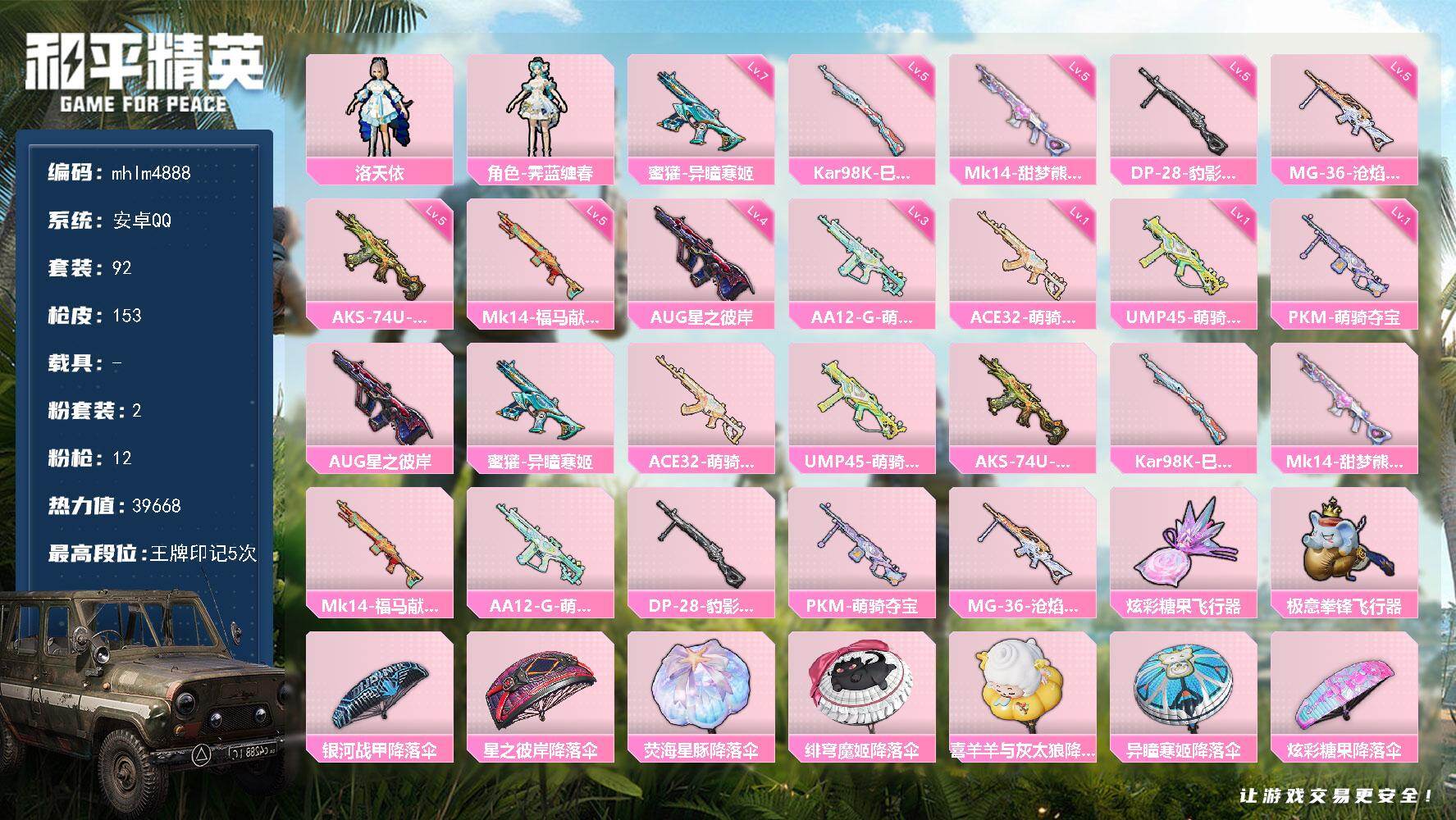 安卓 手Q-2粉装-12特效枪-0载具-2粉色飞行器-39668热力值-5王牌印