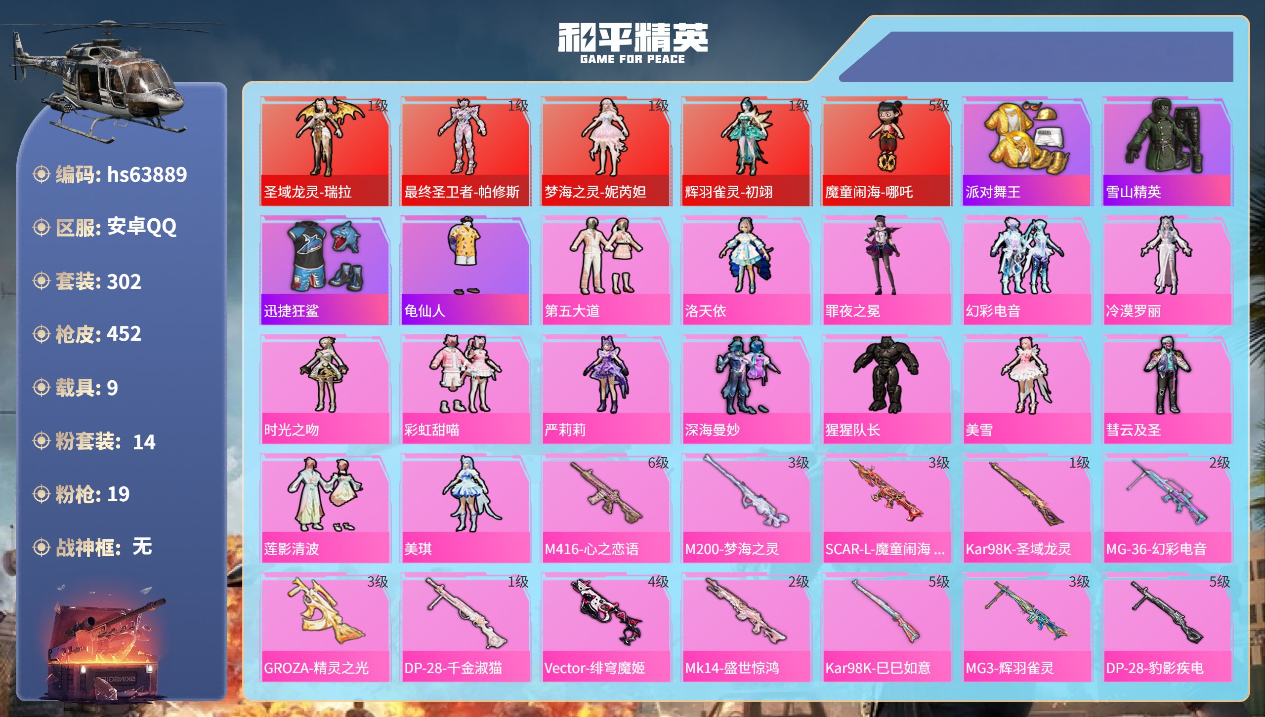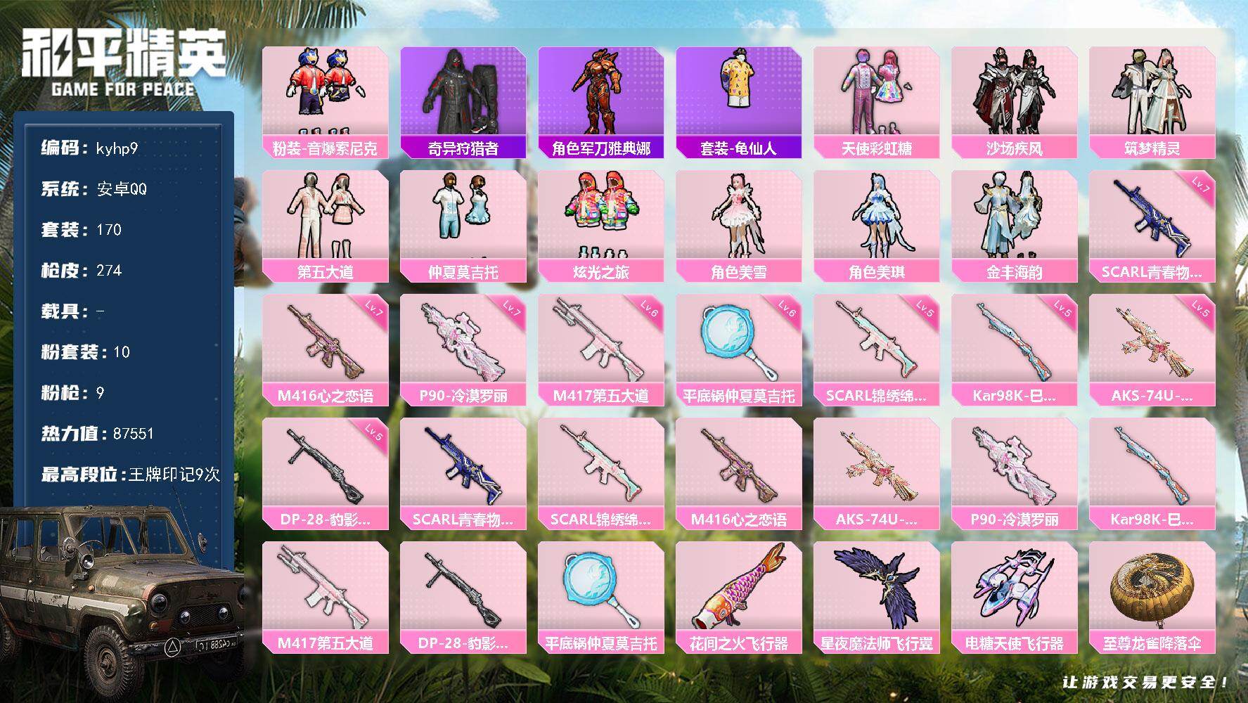 安卓 手Q-10粉装-9特效枪-0载具-4粉色飞行器-87551热力值-9王牌