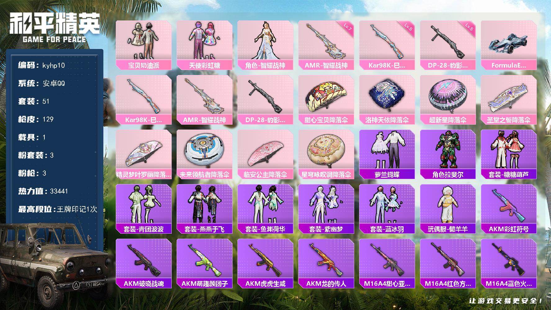 安卓 手Q-3粉装-3特效枪-1载具-0粉色飞行器-33441热力值-1王牌印