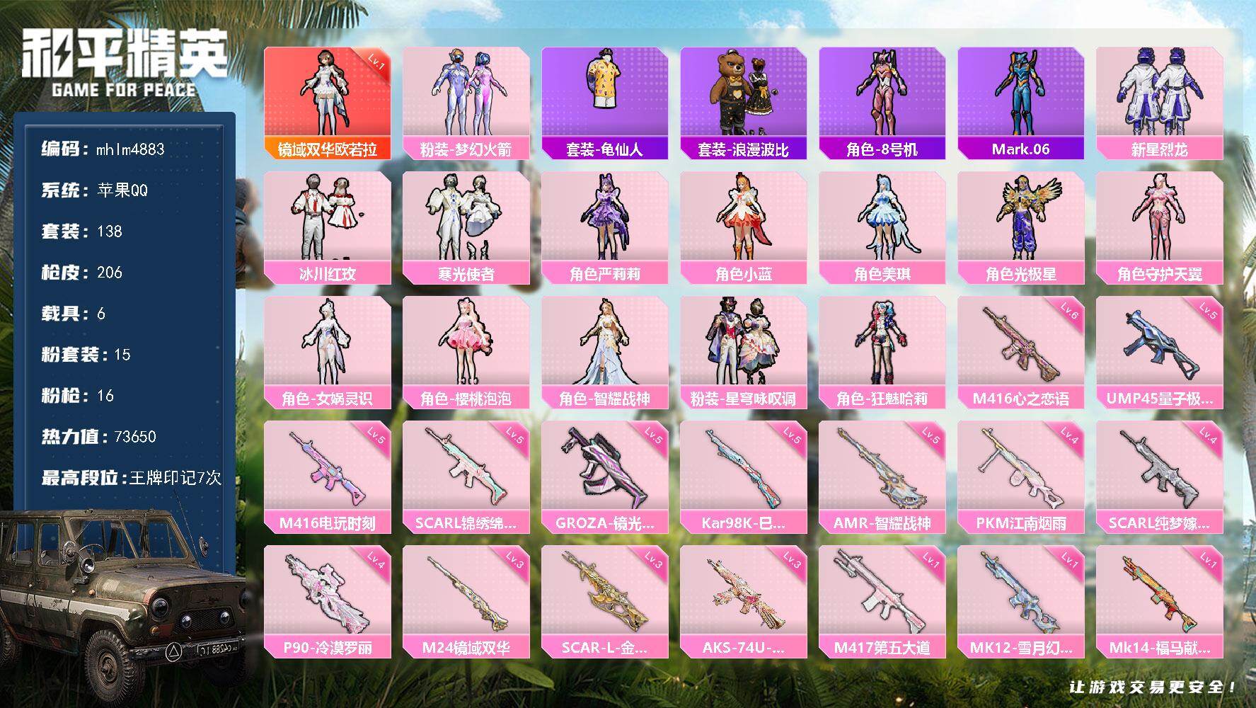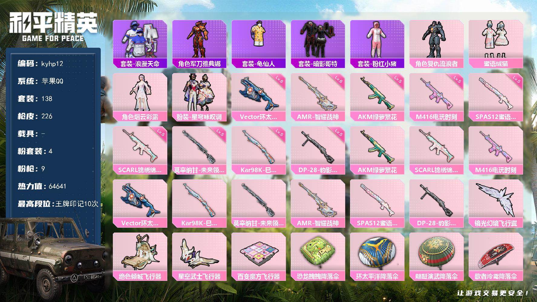 苹果 手Q-4粉装-9特效枪-0载具-5粉色飞行器-64641热力值-10王牌