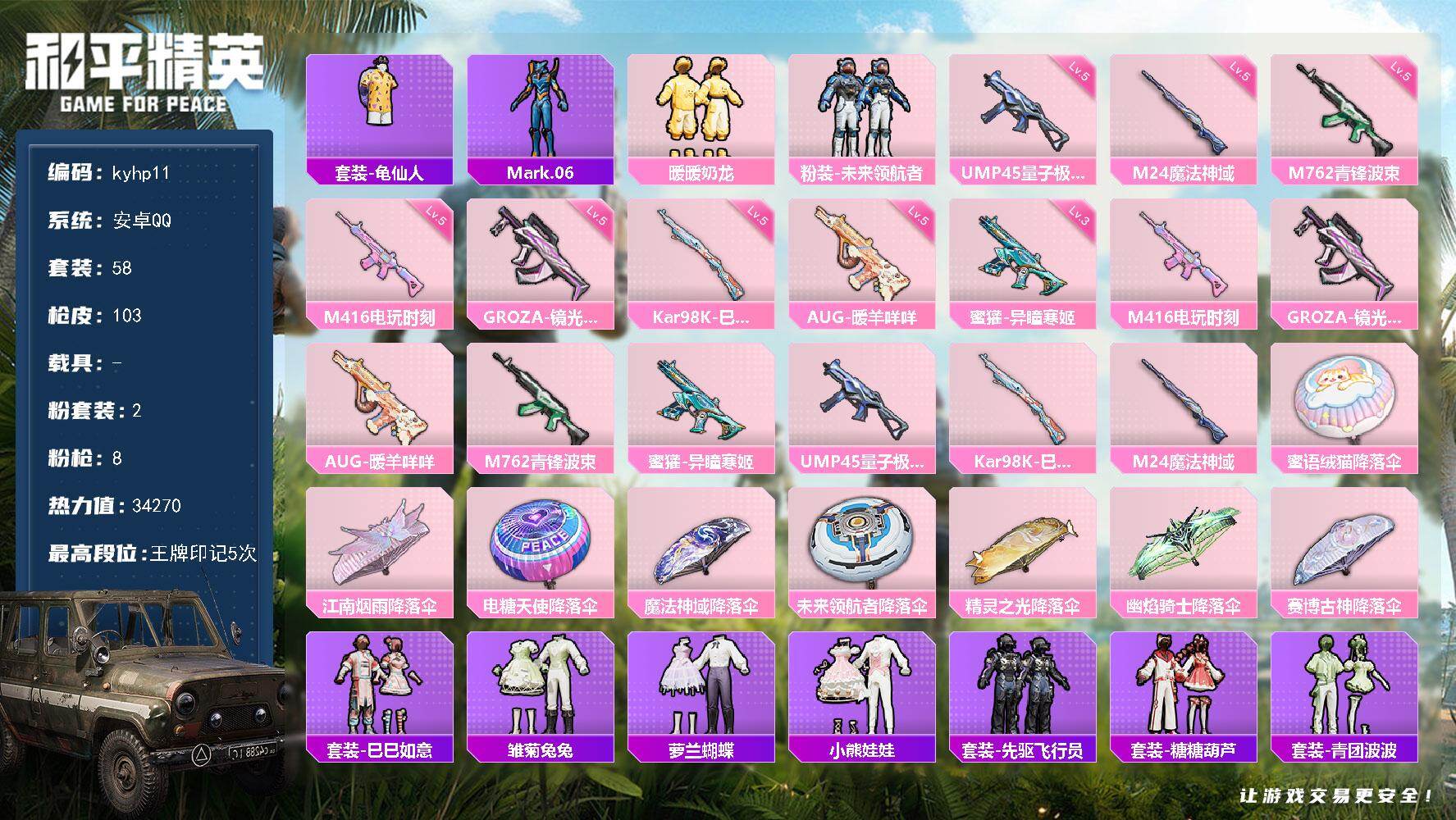 安卓 手Q-2粉装-8特效枪-0载具-0粉色飞行器-34270热力值-5王牌印