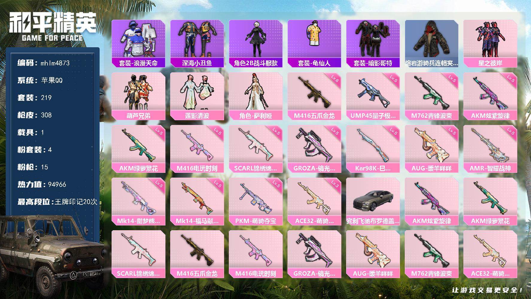 苹果 手Q-4粉装-15特效枪-1载具-4粉色飞行器-94966热力值-20王牌