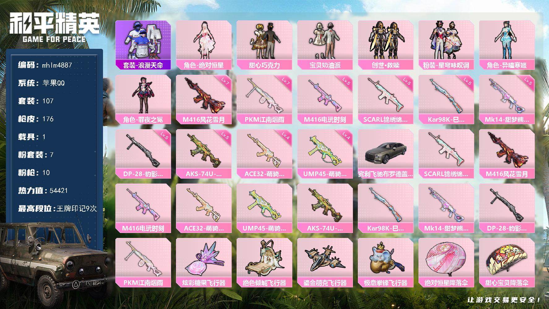苹果 手Q-7粉装-10特效枪-1载具-4粉色飞行器-54421热力值-9王牌印