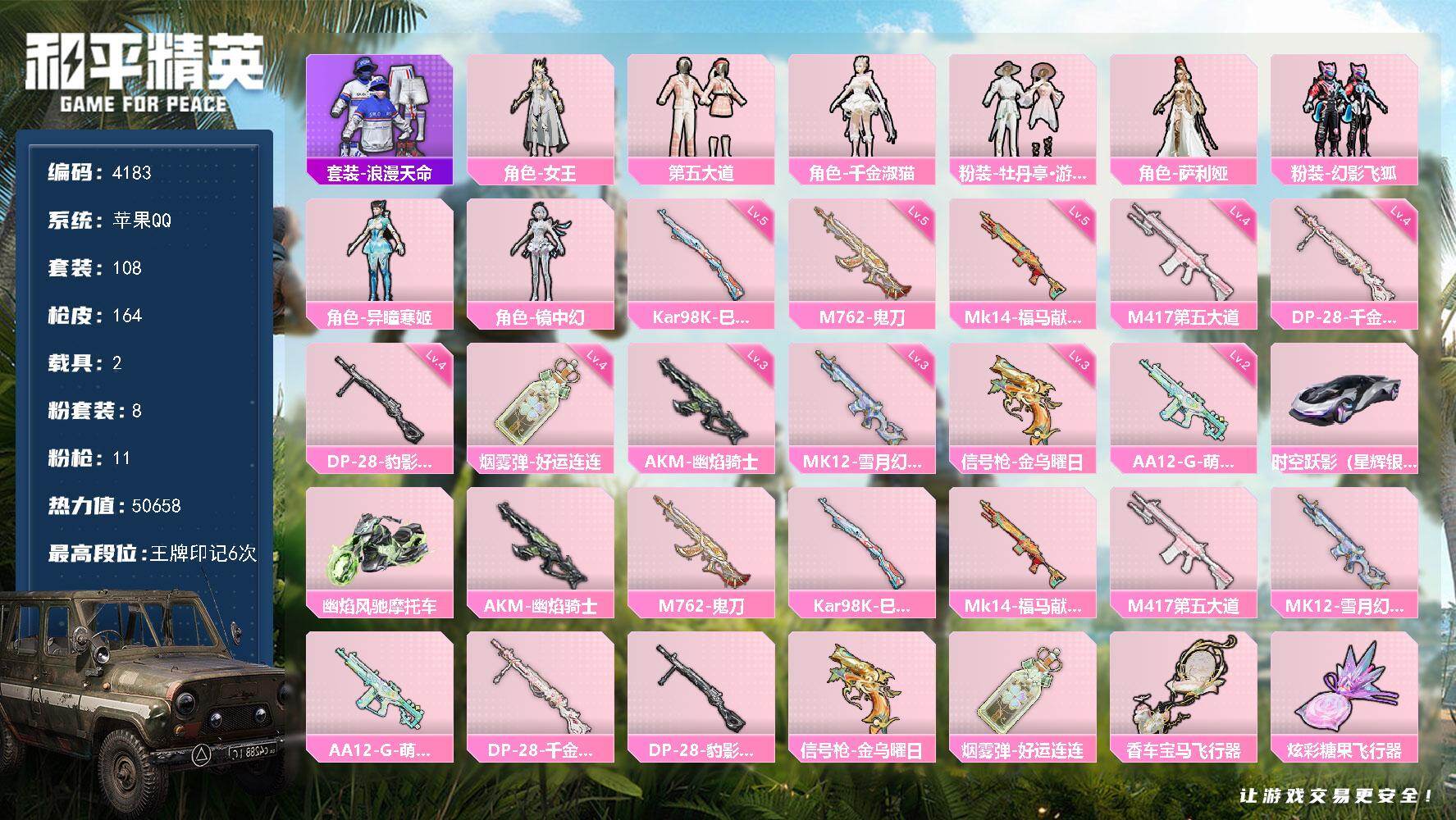 苹果 手Q-4粉装-9特效枪-0载具-5粉色飞行器-64641热力值-10王牌
