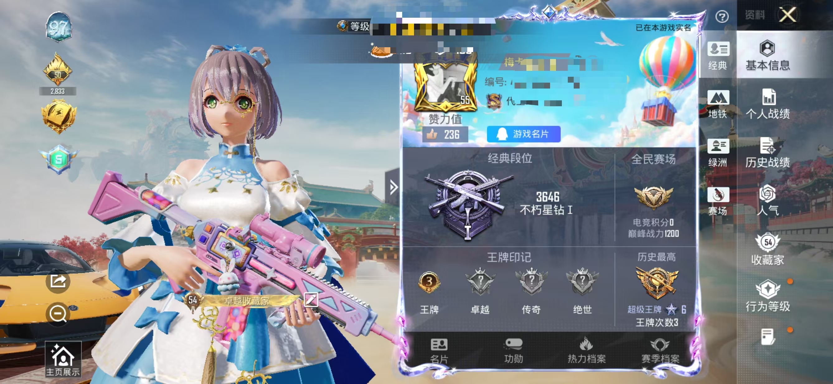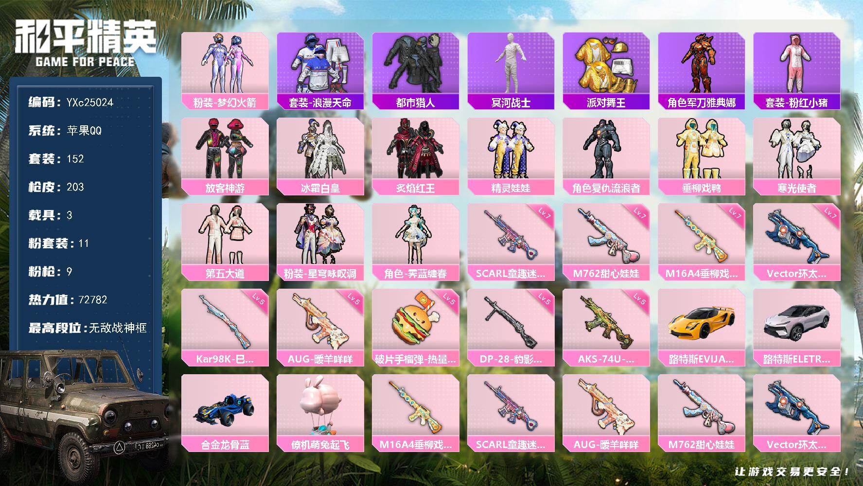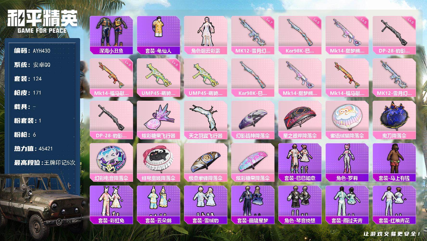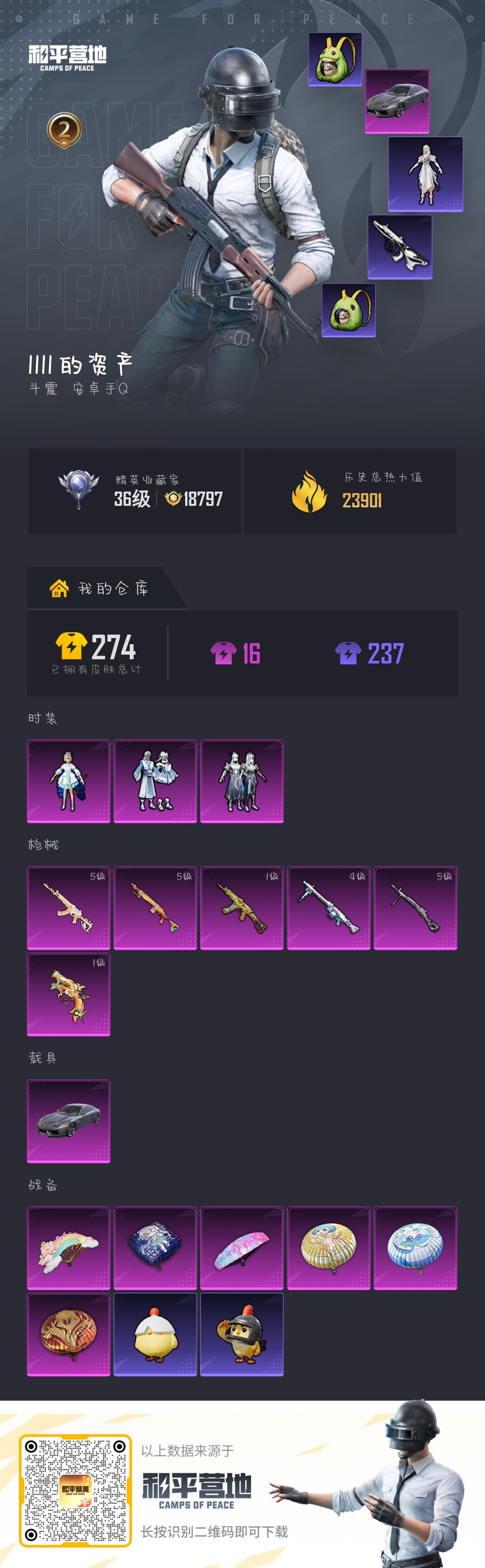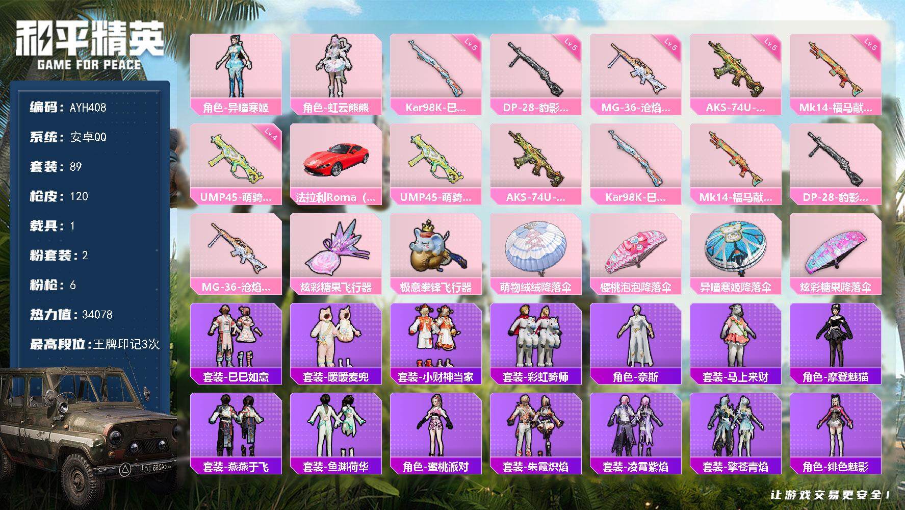 安卓 手Q-2粉装-6特效枪-1载具-2粉色飞行器-34078热力值-3王牌印记