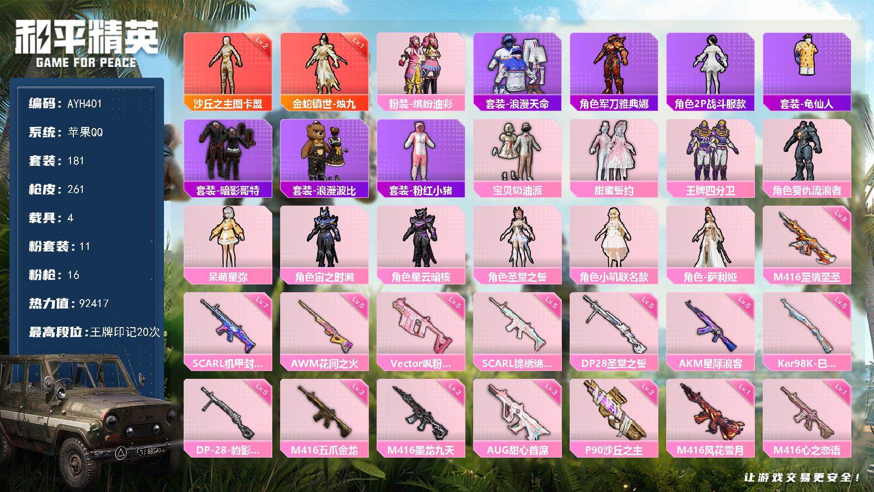 2神装-11粉装-16特效枪-4载具-6粉色飞行器-92417热力值-20王牌印记-181套装-261枪皮
