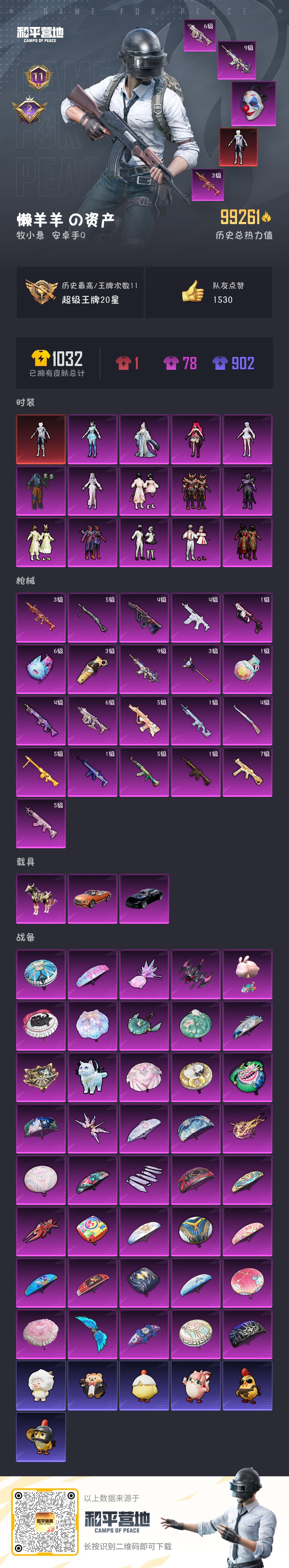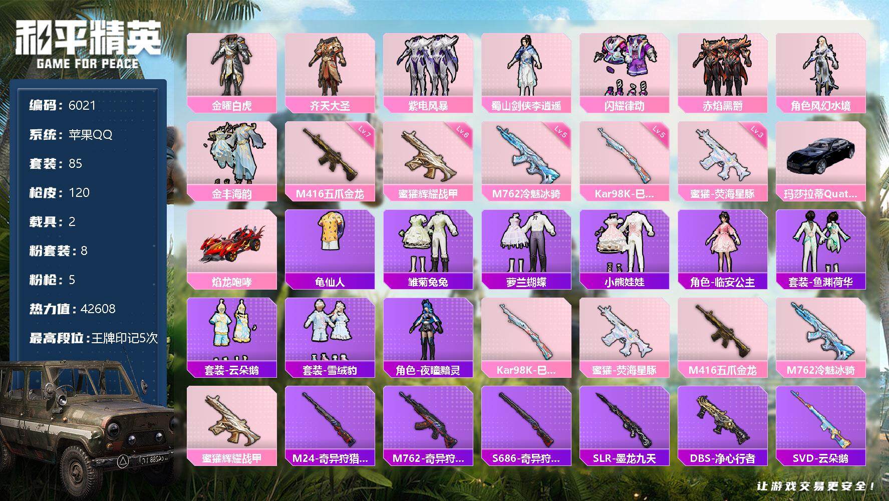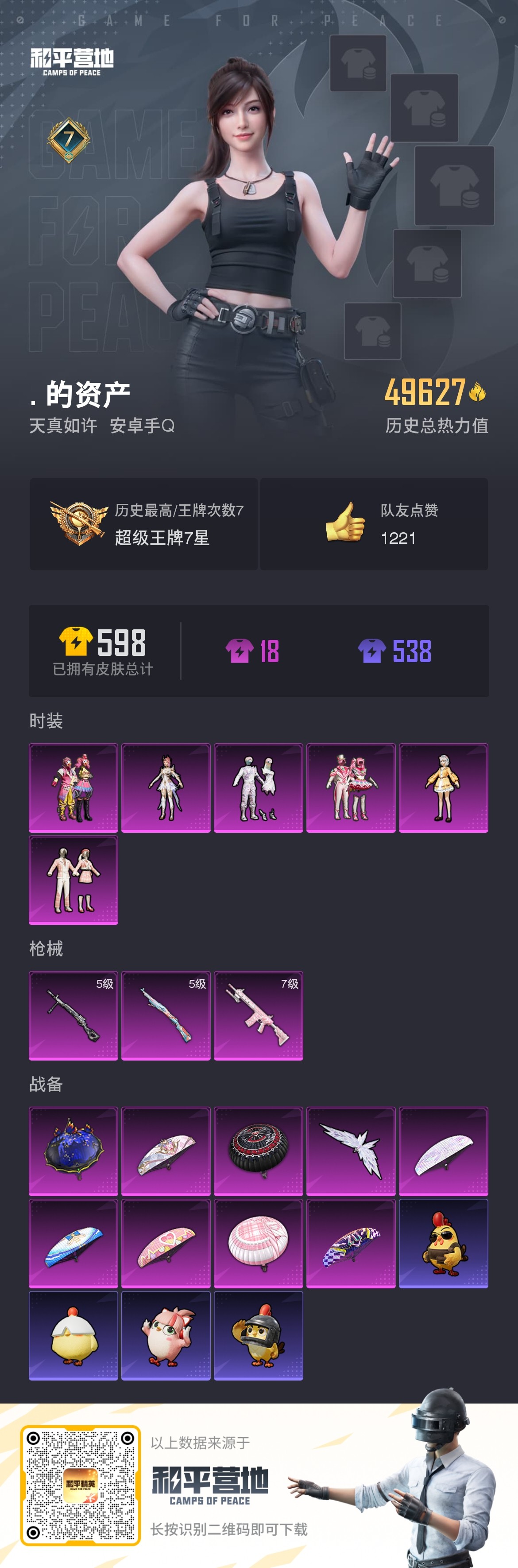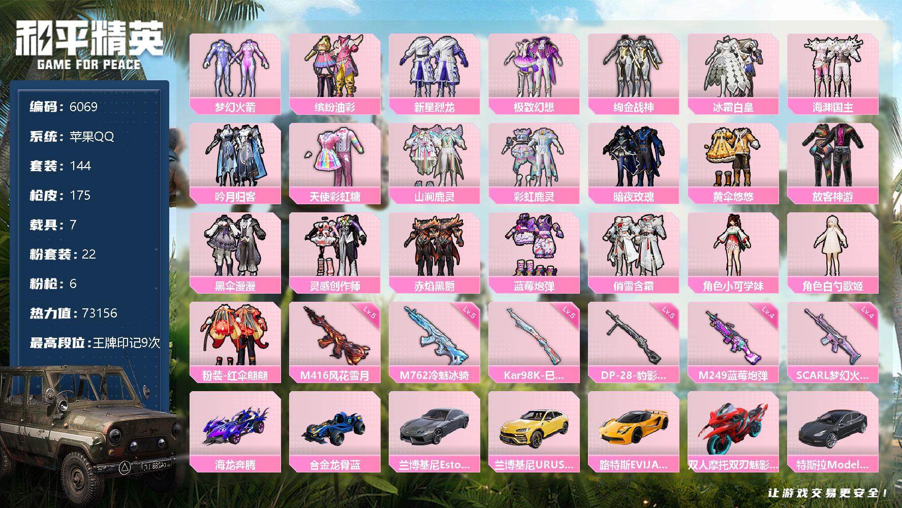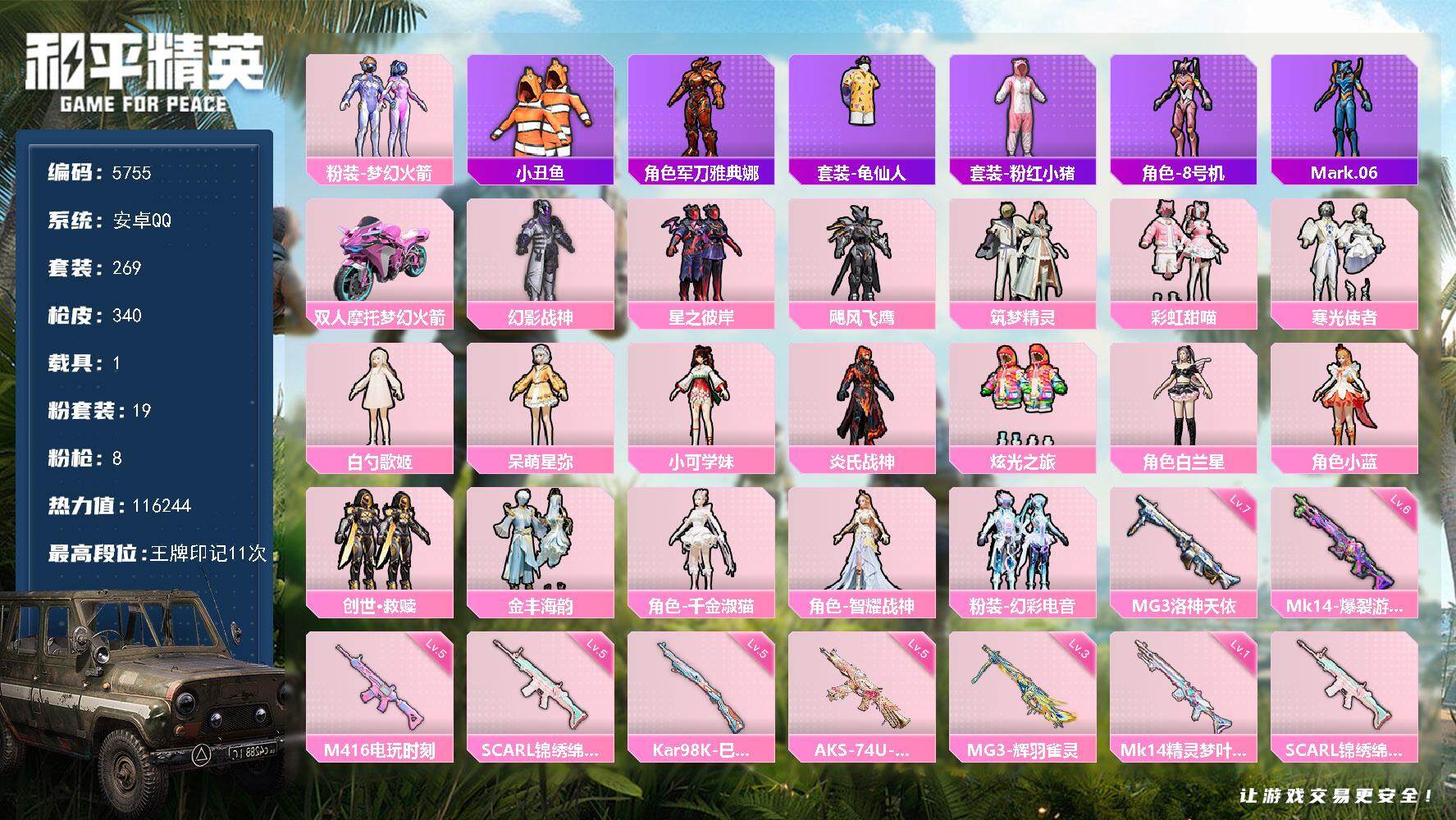 安卓QQ-无二次包人脸-9王牌印记-9粉装-5红装-20特效枪-8载具-110644热力值-战备72