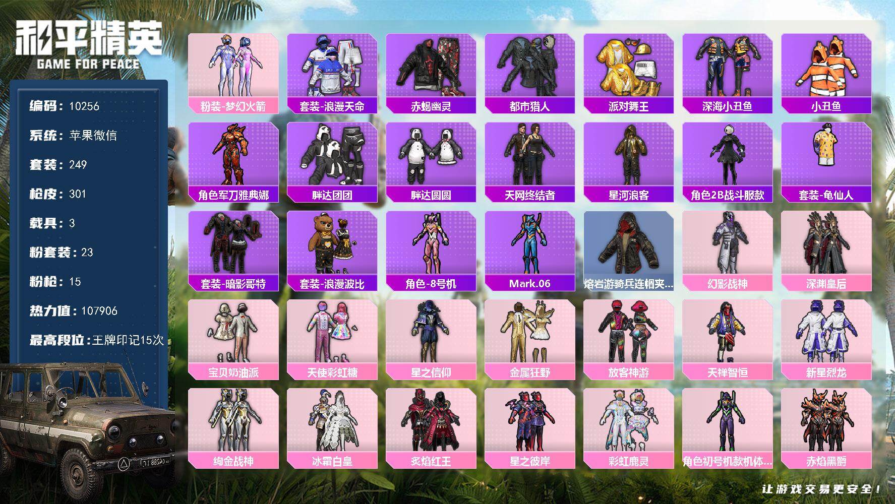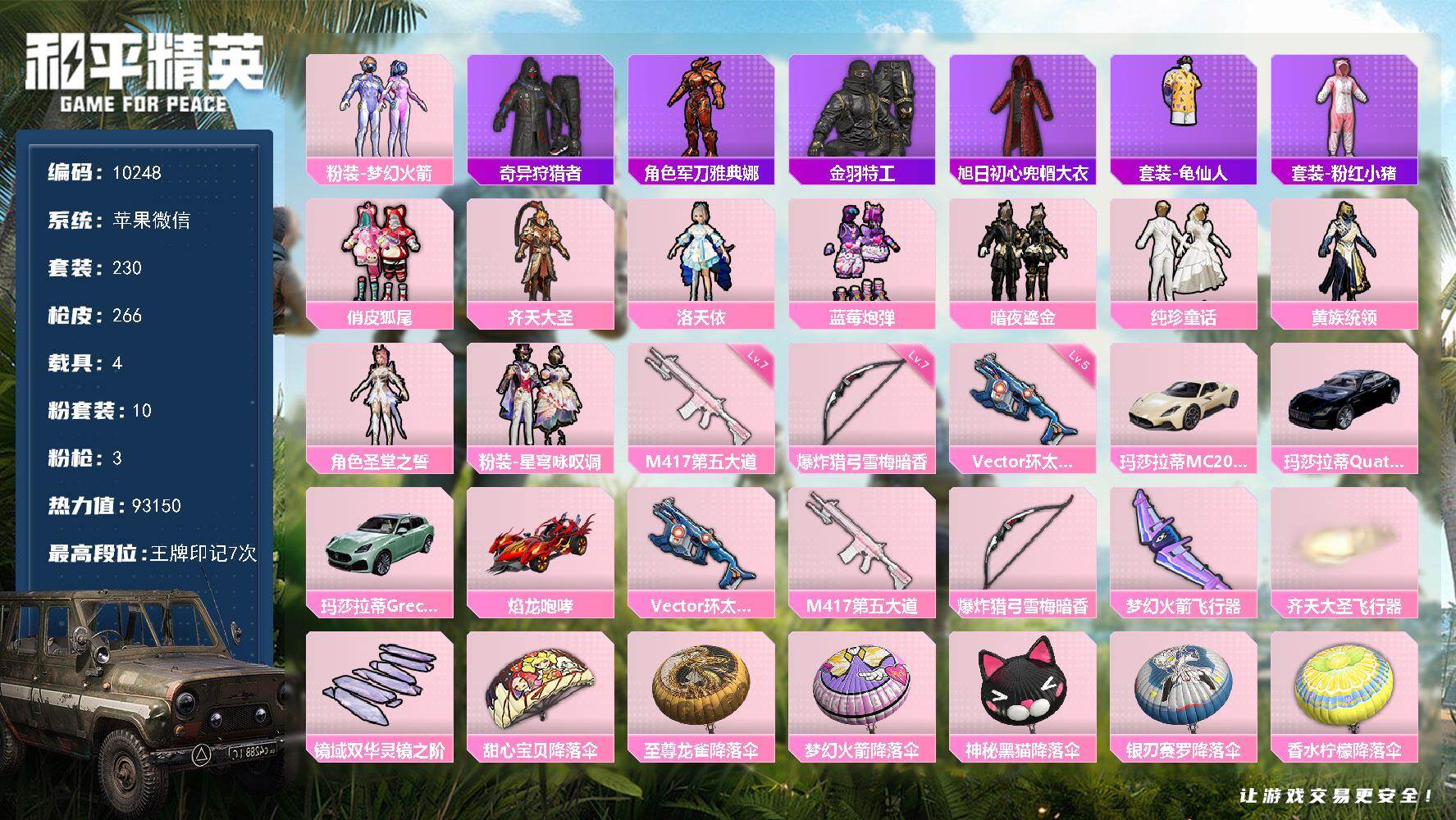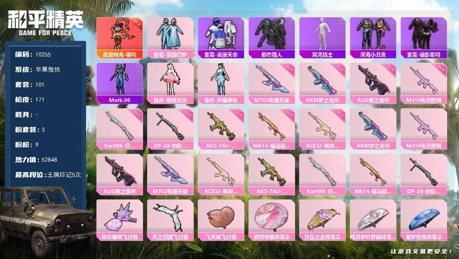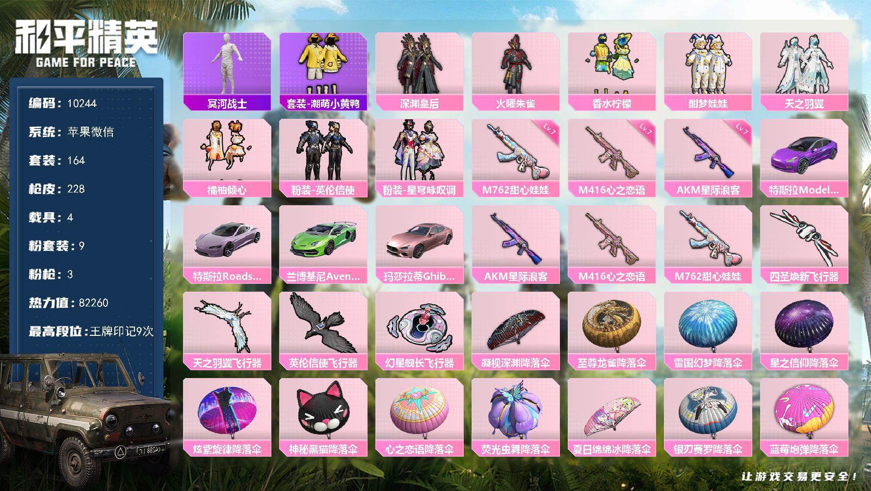 木乃伊!苹果 微信-9粉装-3特效枪-4载具-4粉色飞行器-82260热力值-