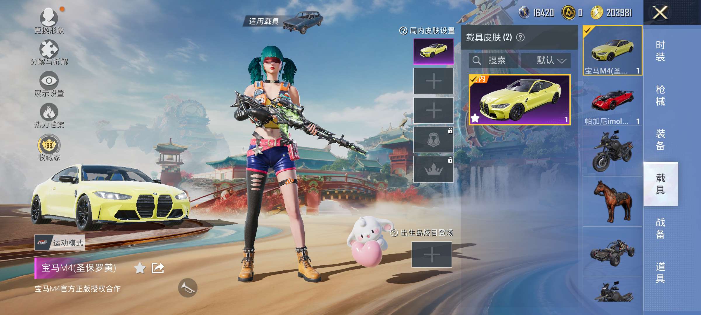 有两辆车,一辆宝马m4,一辆帕加尼。5套粉装,8把特效枪