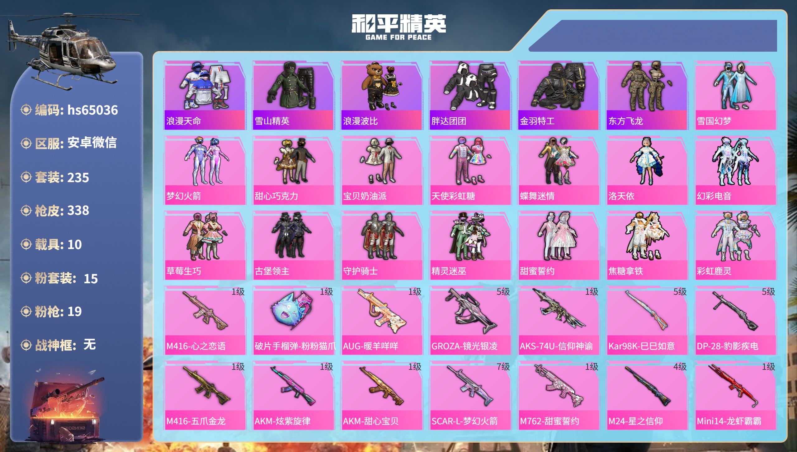安卓微信-14王牌印记-1红装-13粉装-22特效枪-2载具-热