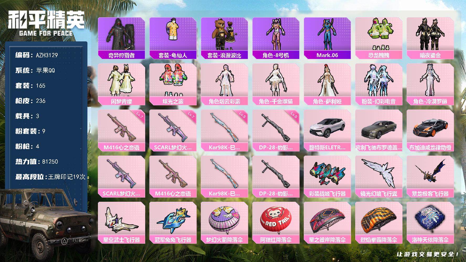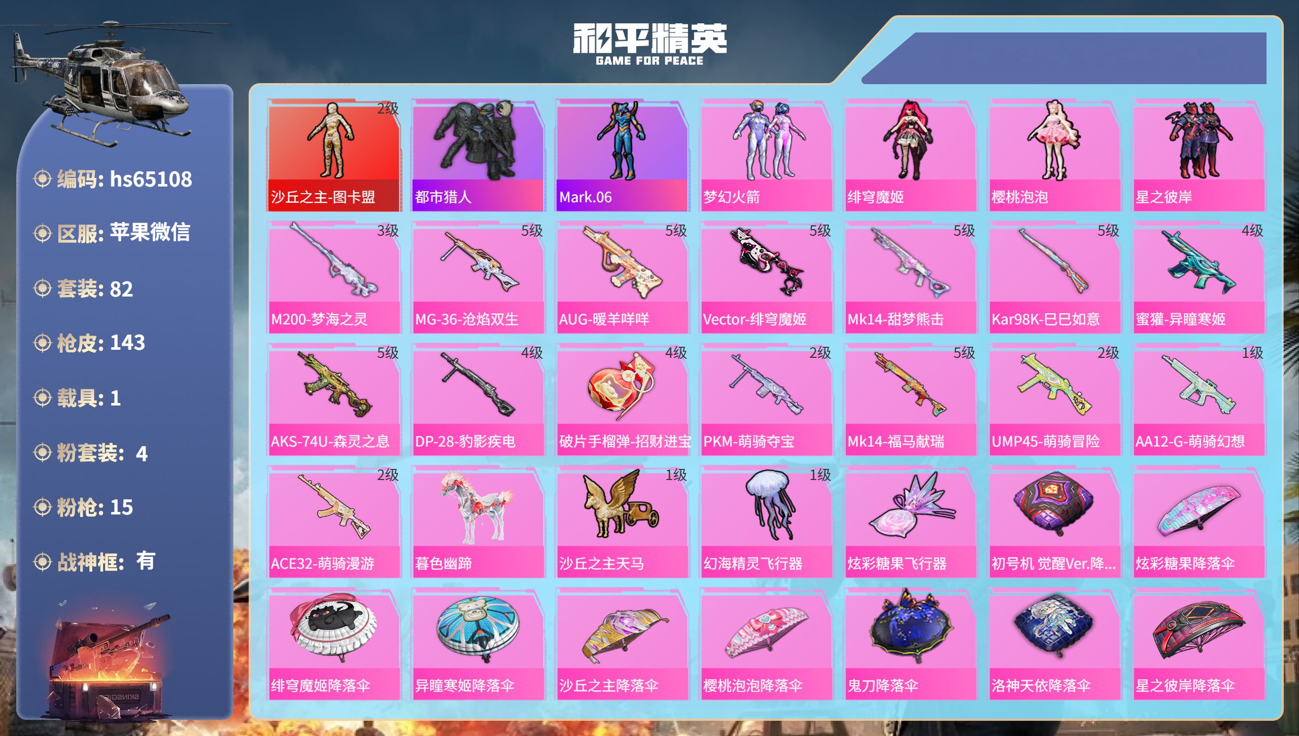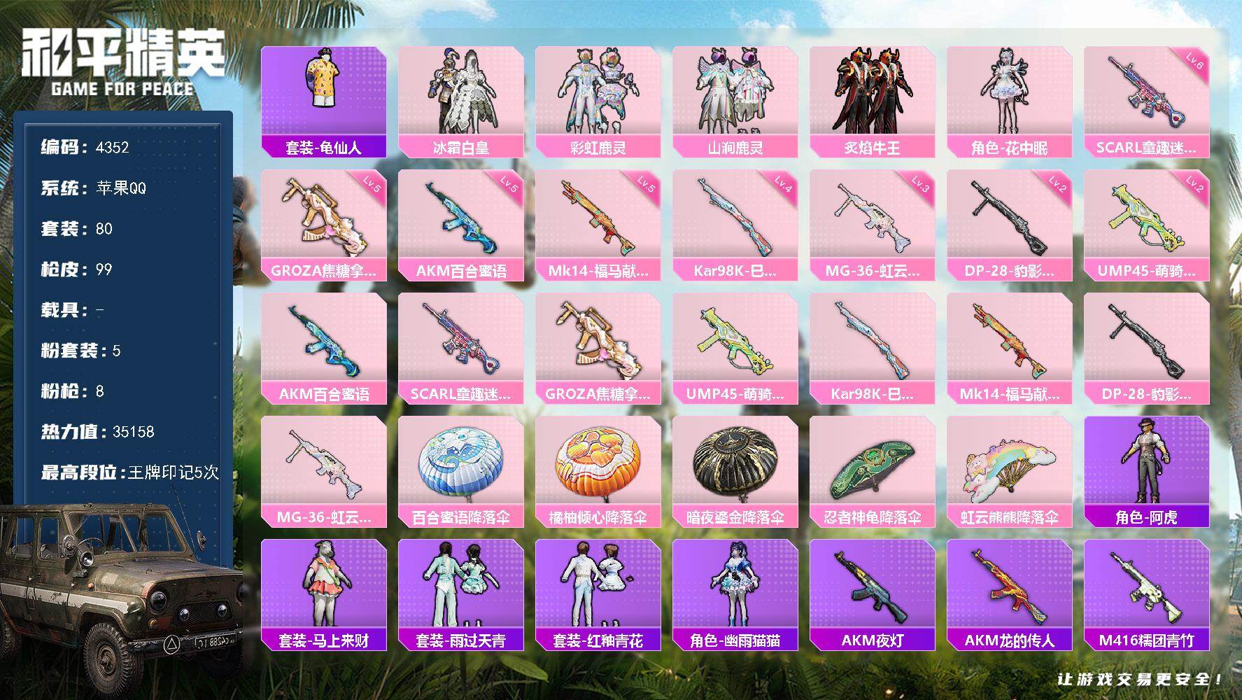 苹果 手Q-5粉装-8特效枪-0载具-0粉色飞行器-35158热力值-5王牌印记
