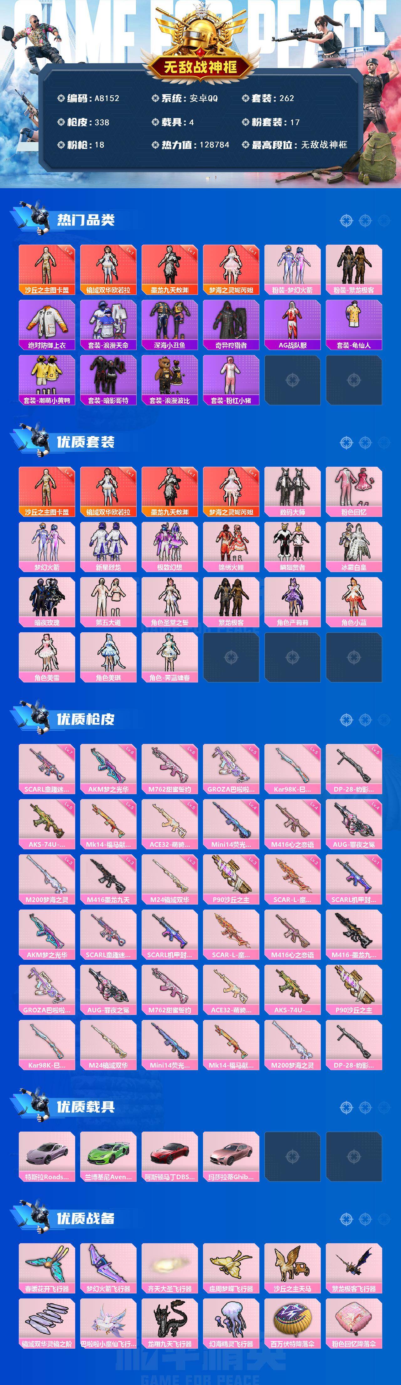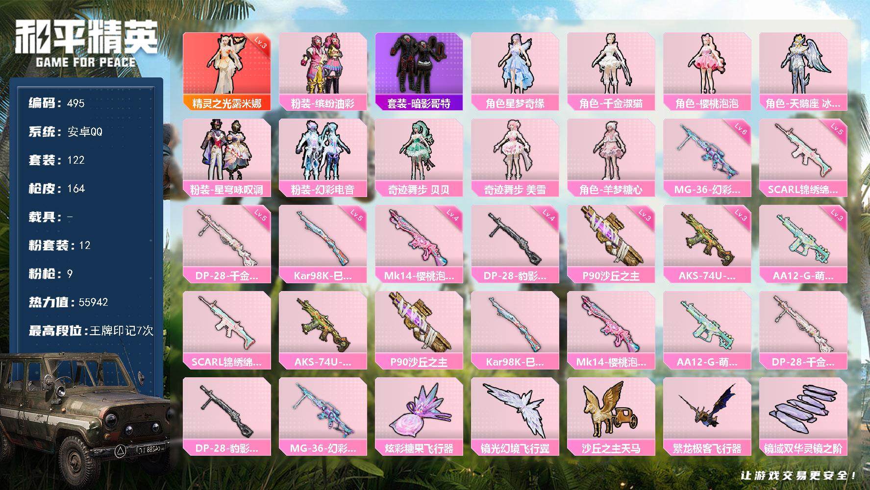 安卓 手Q-1神装-12粉装-9特效枪-0载具-6粉色飞行器-55942热力值-