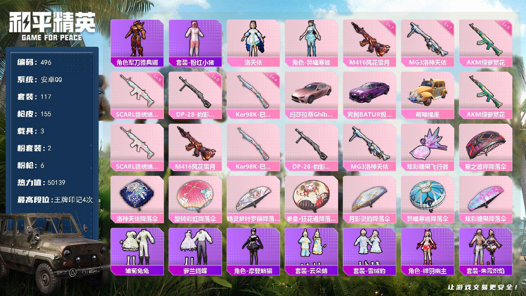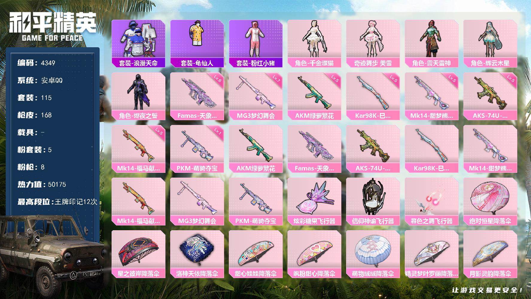 安卓 手Q-5粉装-8特效枪-0载具-3粉色飞行器-50175热力值-12王牌印