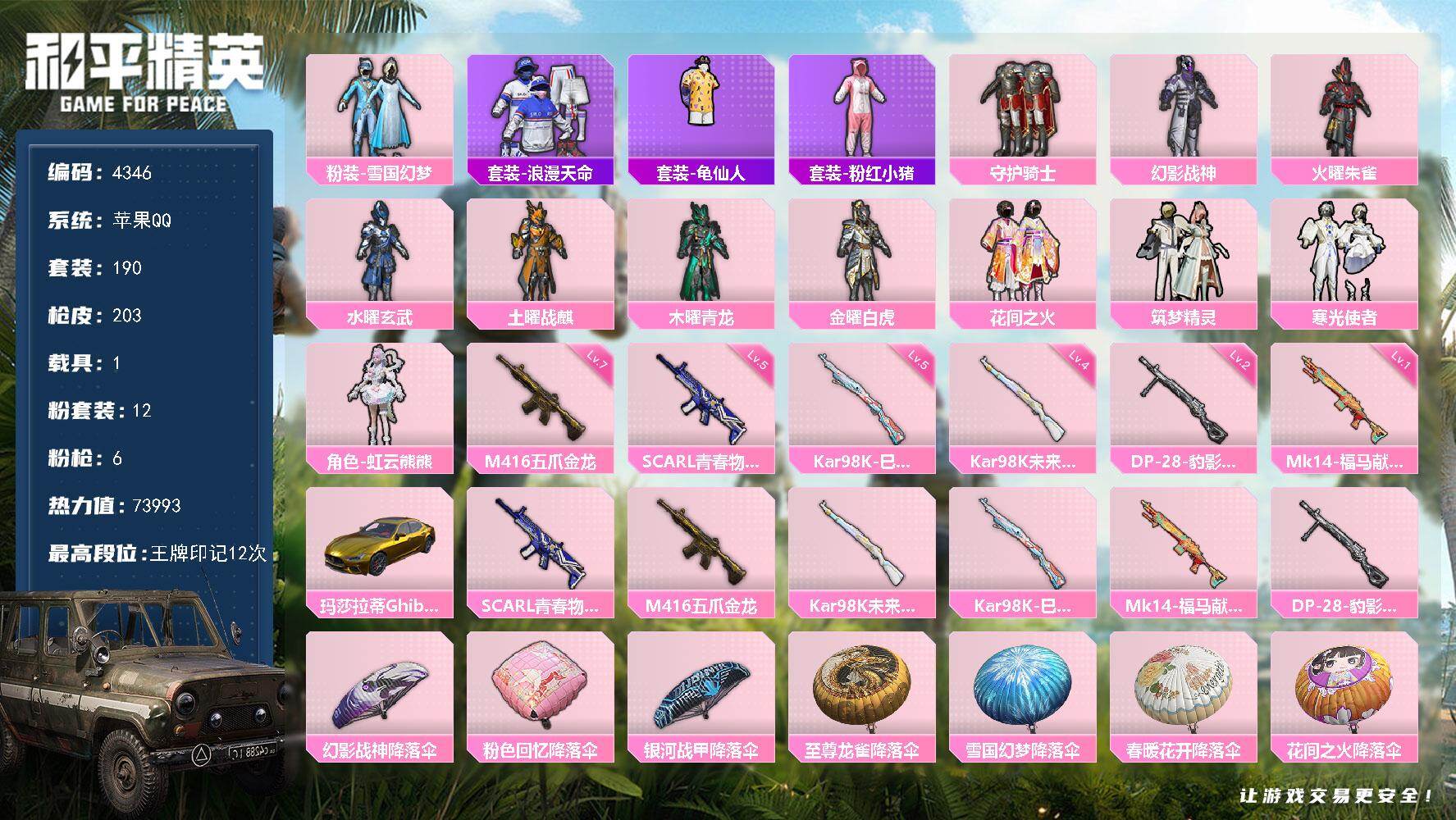 苹果 手Q-12粉装-6特效枪-1载具-0粉色飞行器-73993热力值-12王牌