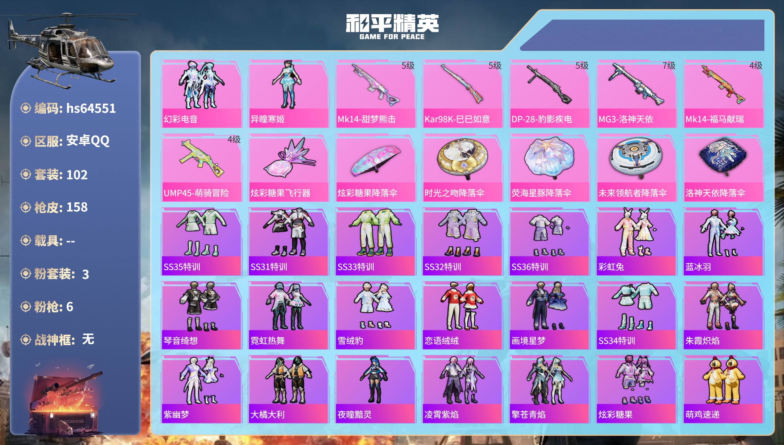 6粉装-12特效枪-1载具-2粉色飞行器-54604热力值-6王牌印记-147套装-171枪皮