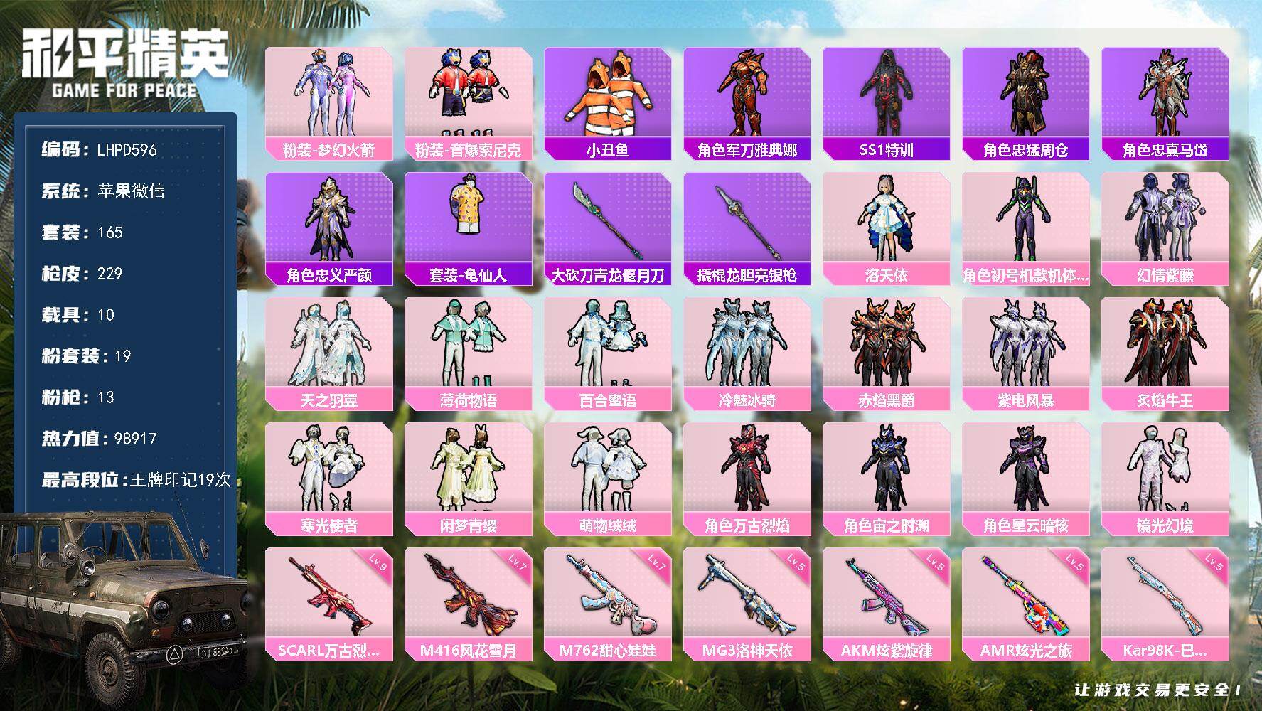 19粉装-13特效枪-10载具-8粉色飞行器-98917热力值-19王牌印记-165套装-229枪皮