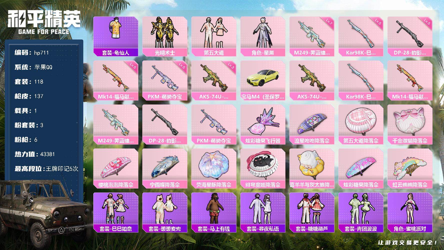 3粉装-6特效枪-1载具-1粉色飞行器-43381热力值-5王牌印记-118套装-137枪皮