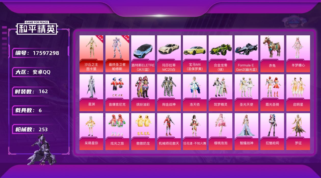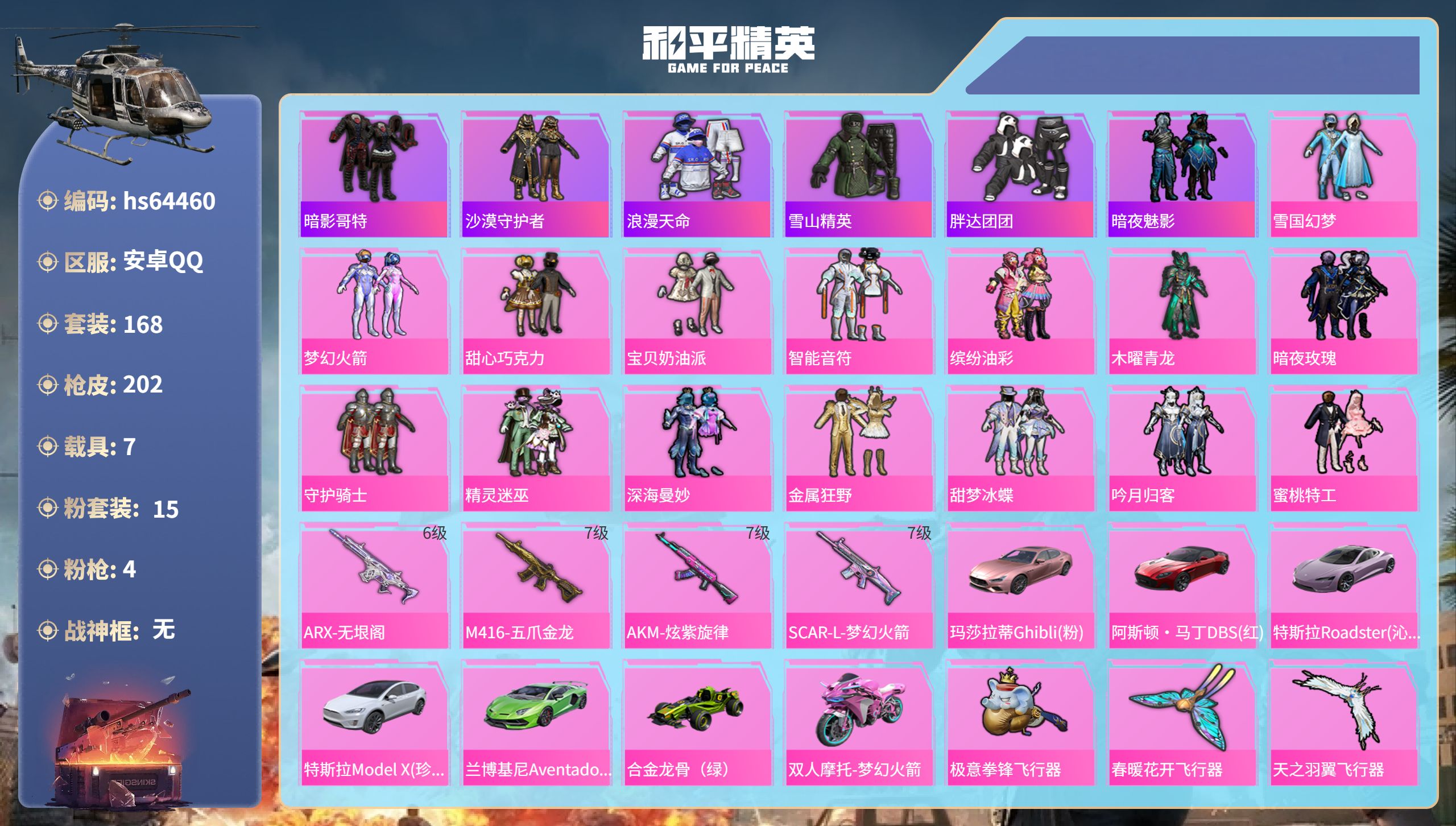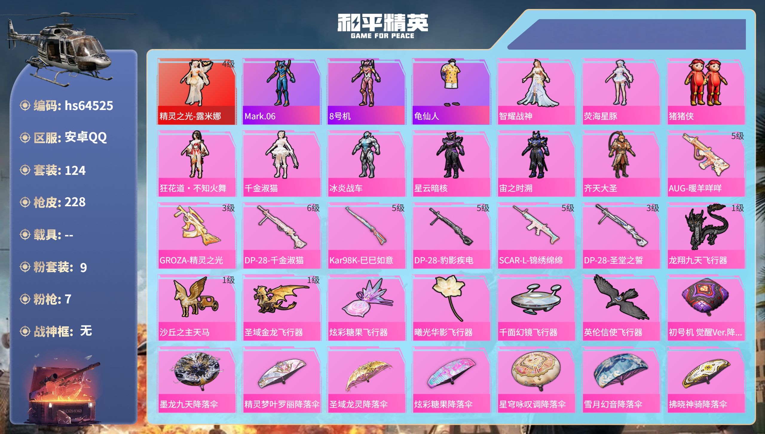 安卓 手Q-4粉装-3特效枪-3载具-1粉色飞行器-58181热力值-5王牌印