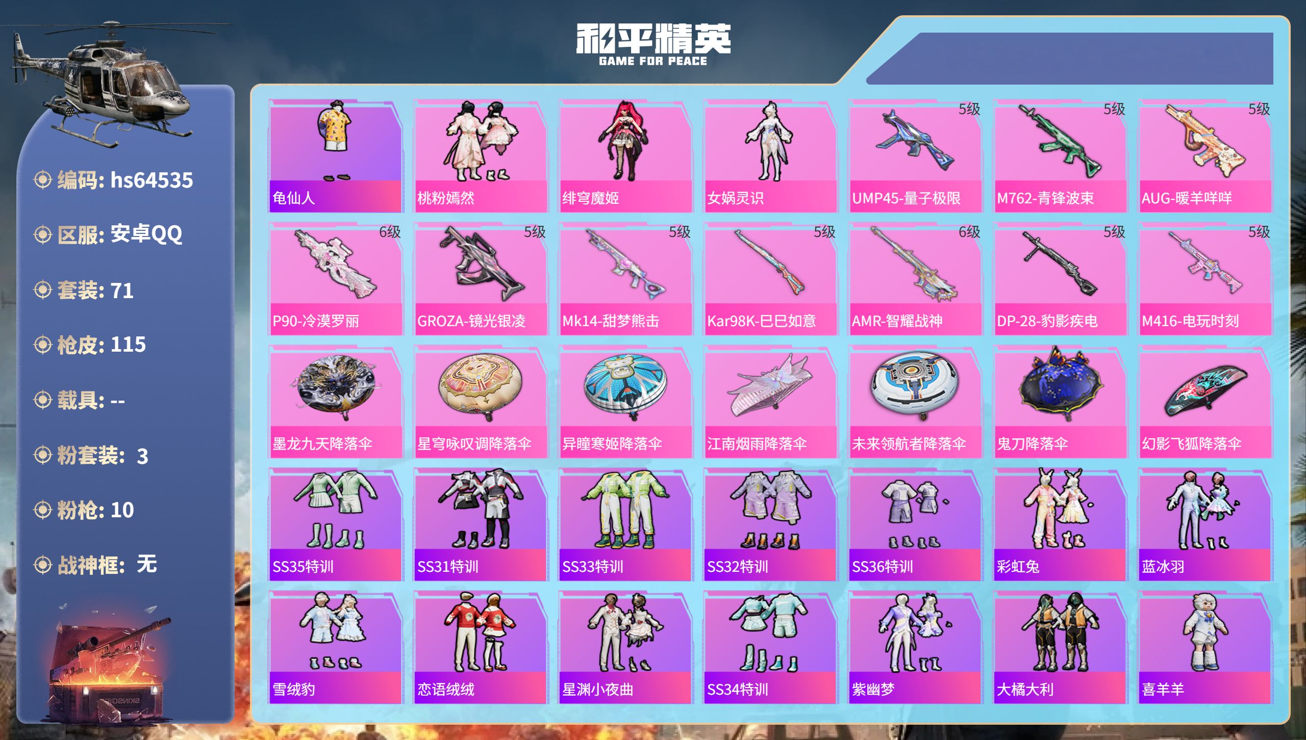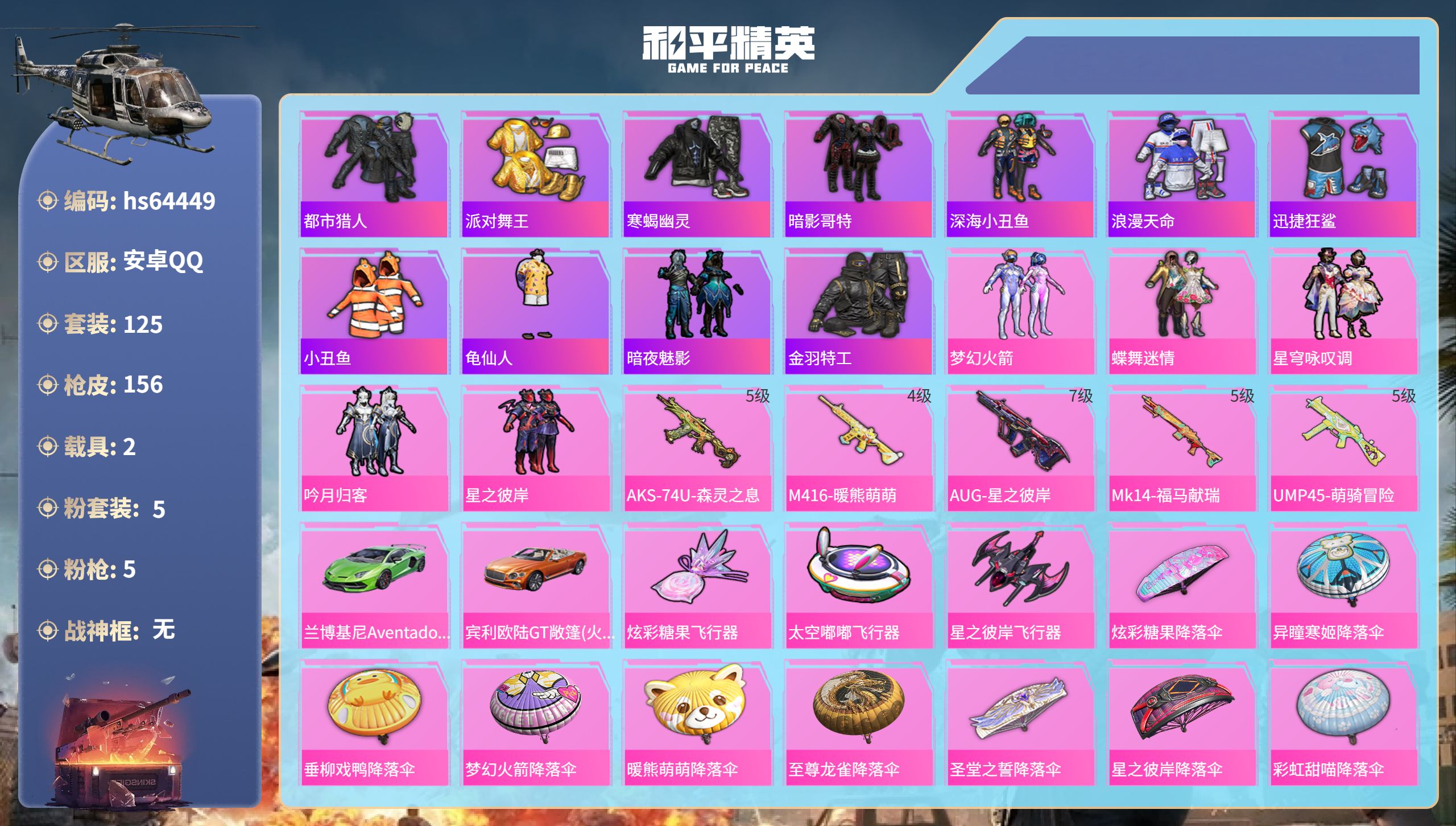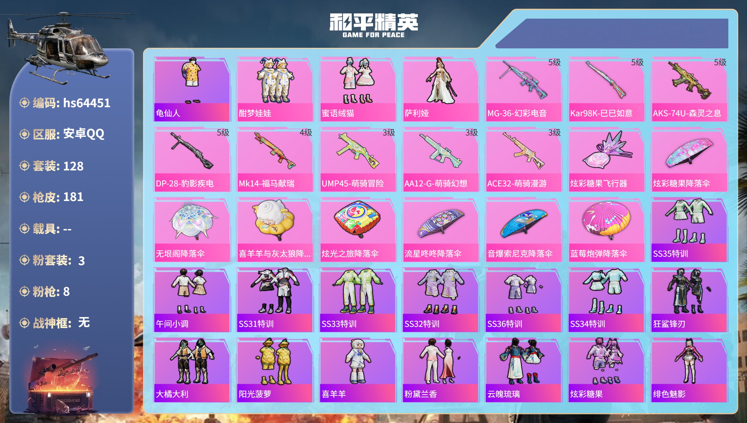 安卓 手Q-4粉装-3特效枪-3载具-1粉色飞行器-58181热力值-5王牌印