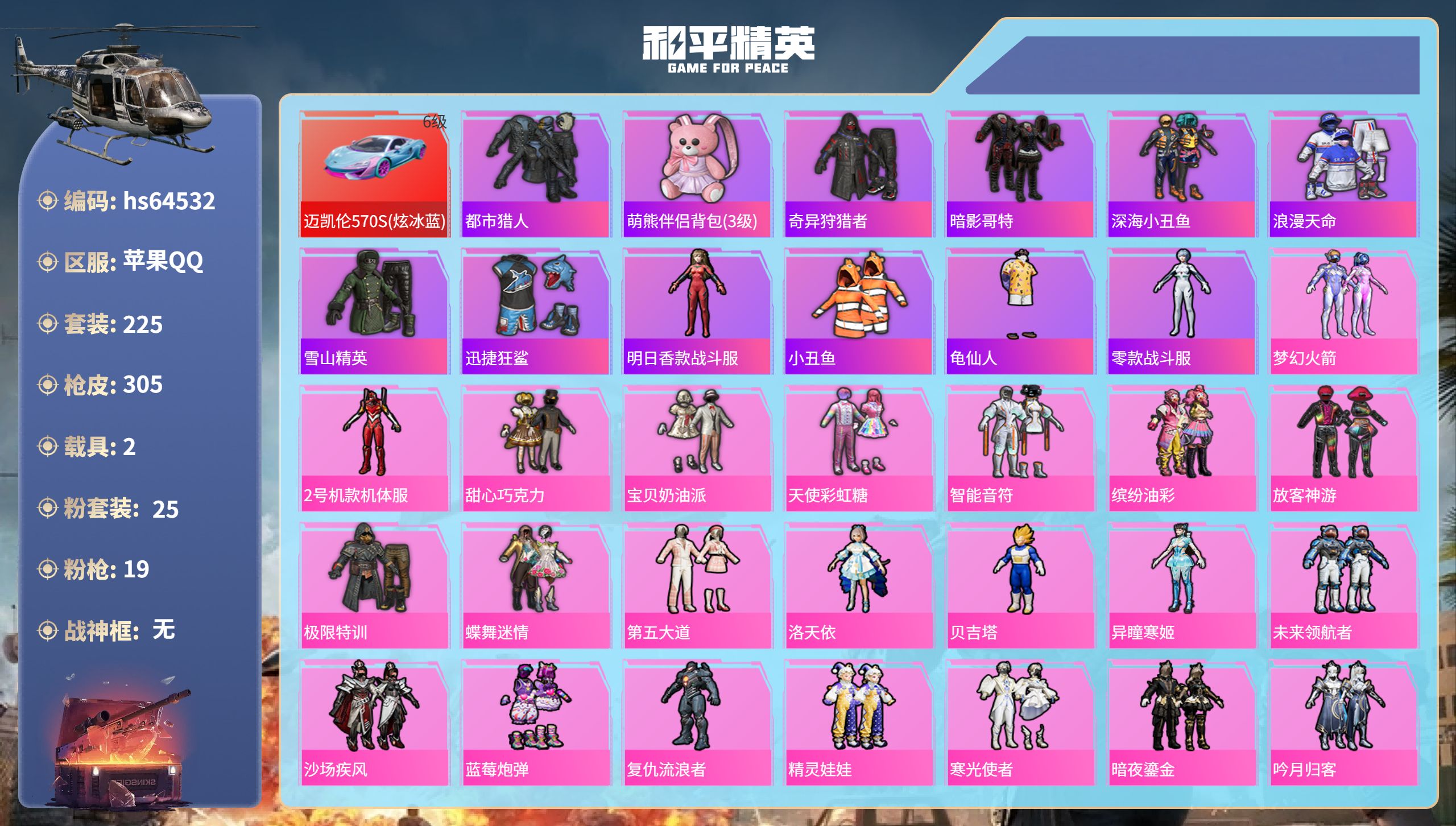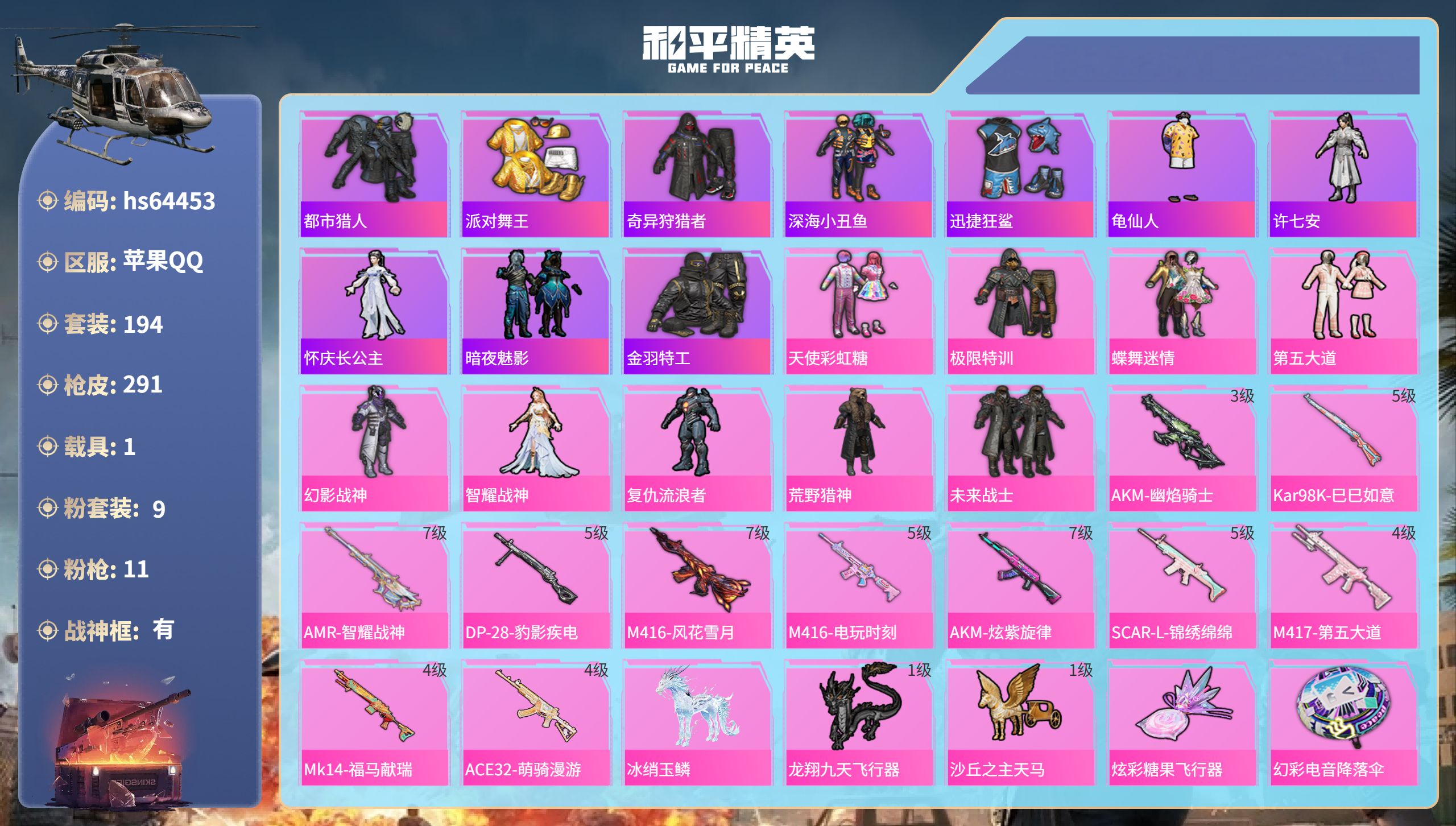 苹果手Q-21王牌印记-有战神框-9粉装-11特效枪-1载具-8