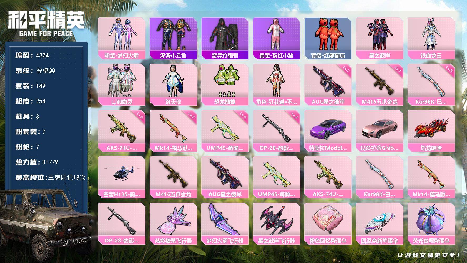 安卓 手Q-7粉装-7特效枪-3载具-3粉色飞行器-81779热力值-18王牌印