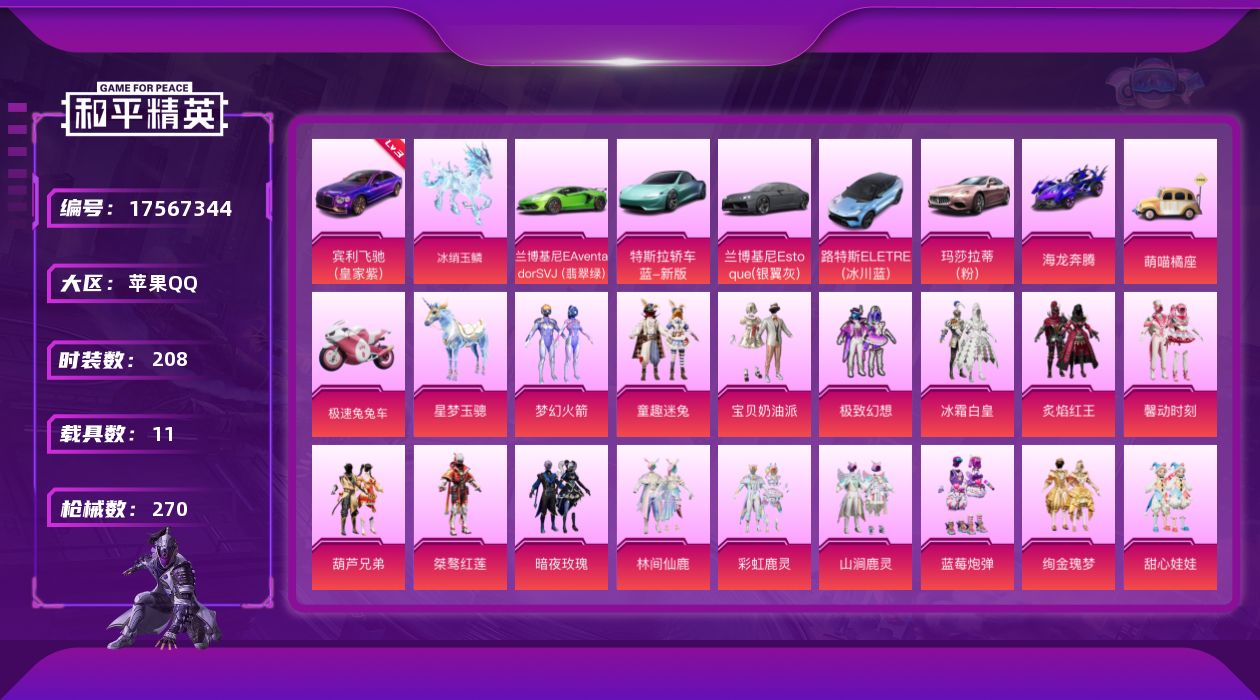 24粉装-12特效枪-0载具-3粉色飞行器-96563热力值-11王牌印记-208套装-266枪皮