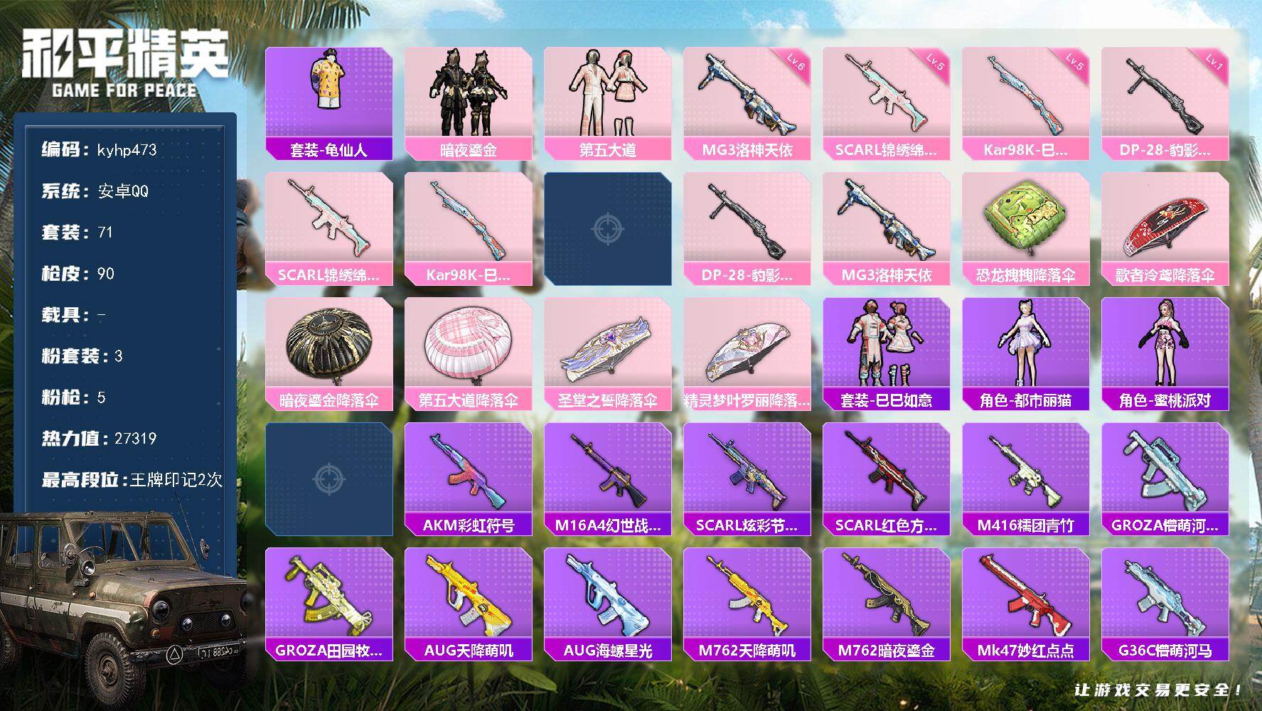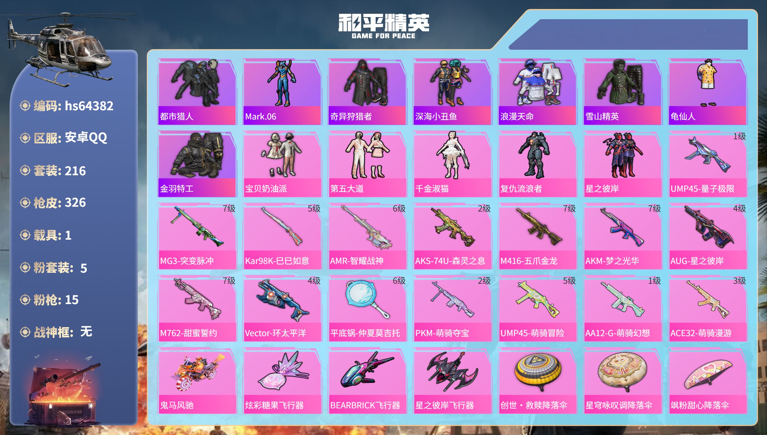 安卓 手Q-4粉装-4特效枪-0载具-3粉色飞行器-53288热力值-5王牌印记