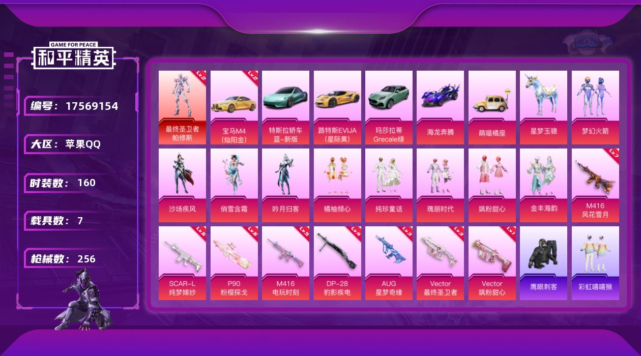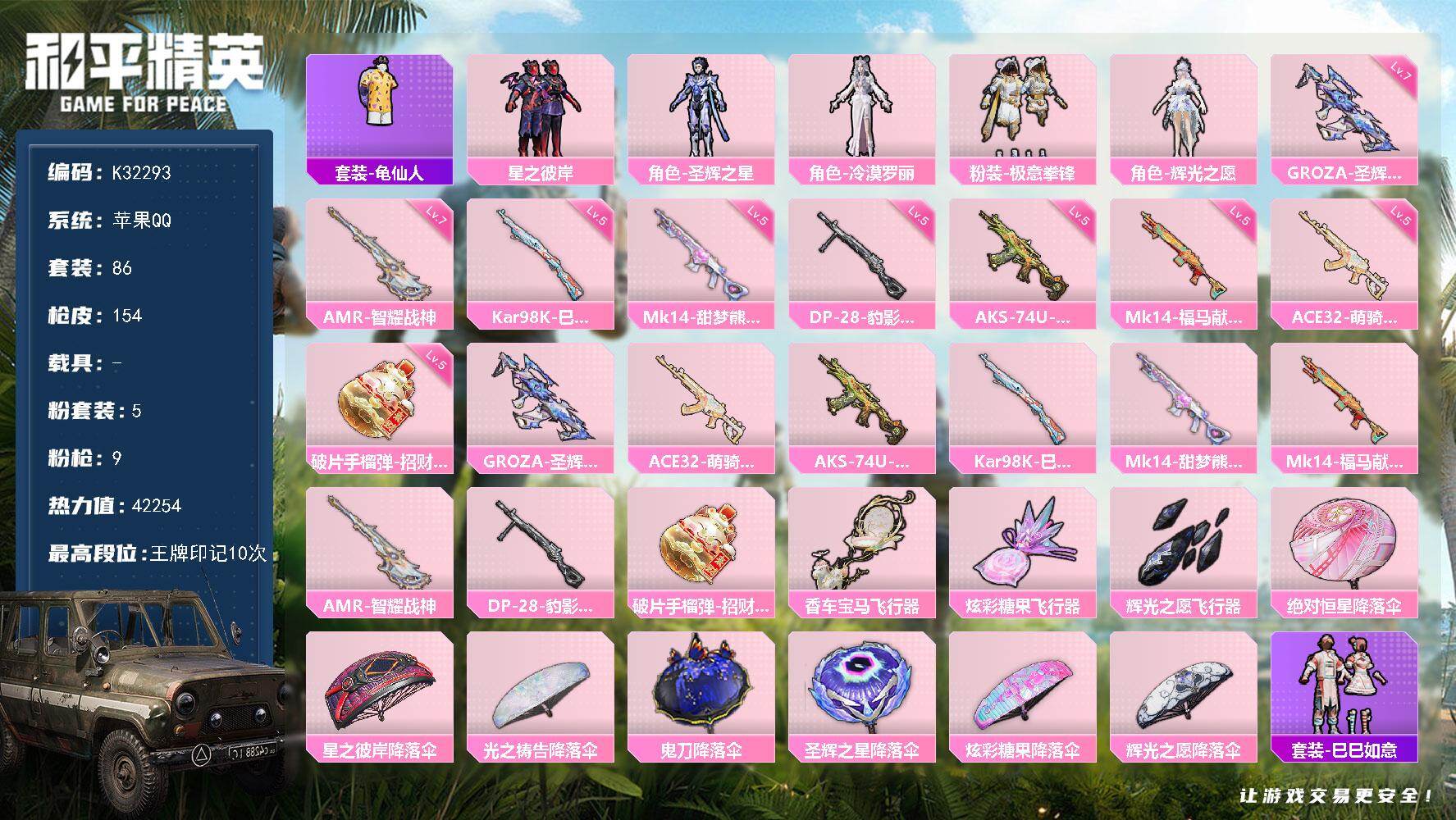 苹果 手Q-5粉装-9特效枪-0载具-3粉色飞行器-42254热力值-10王牌印