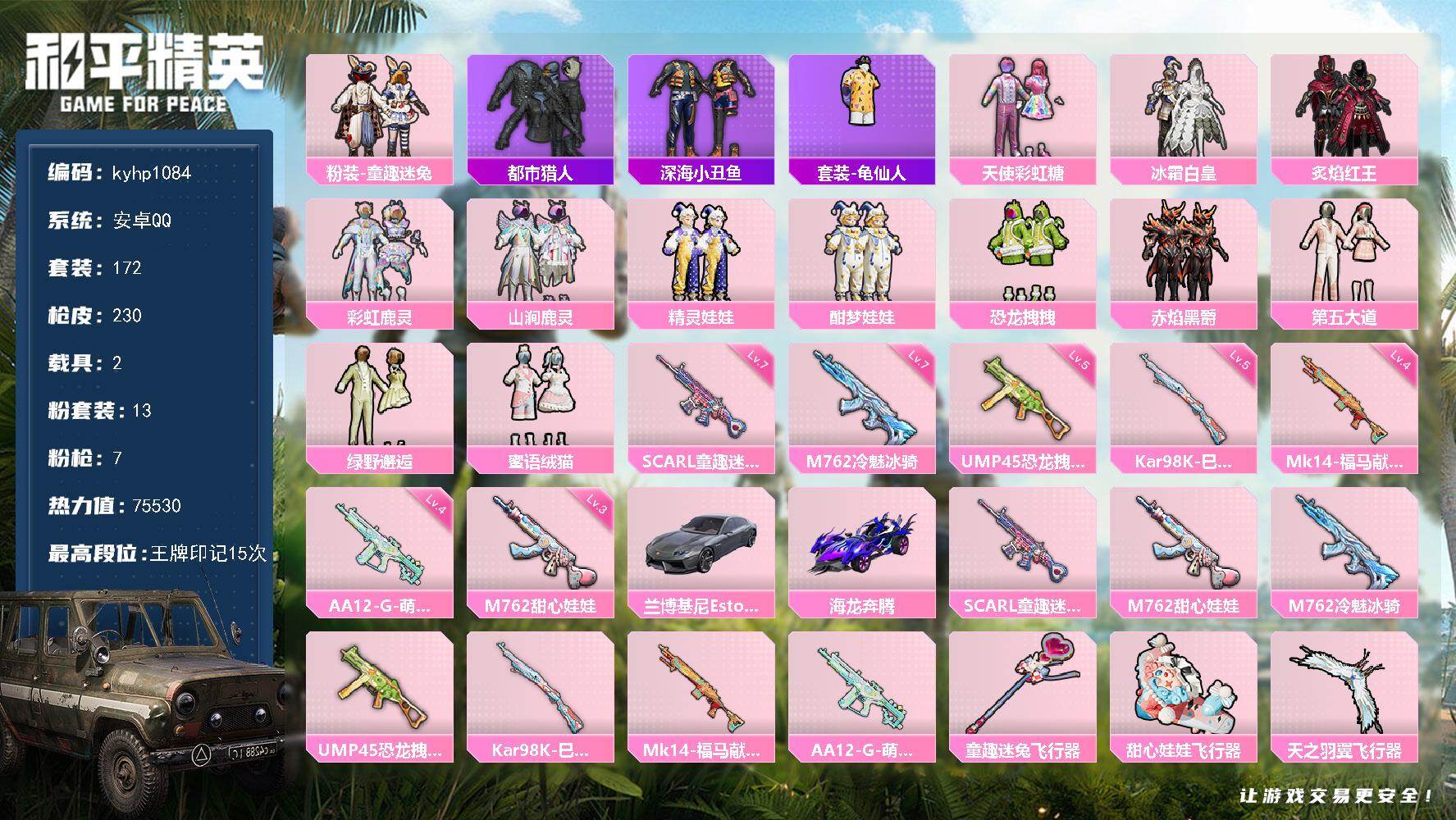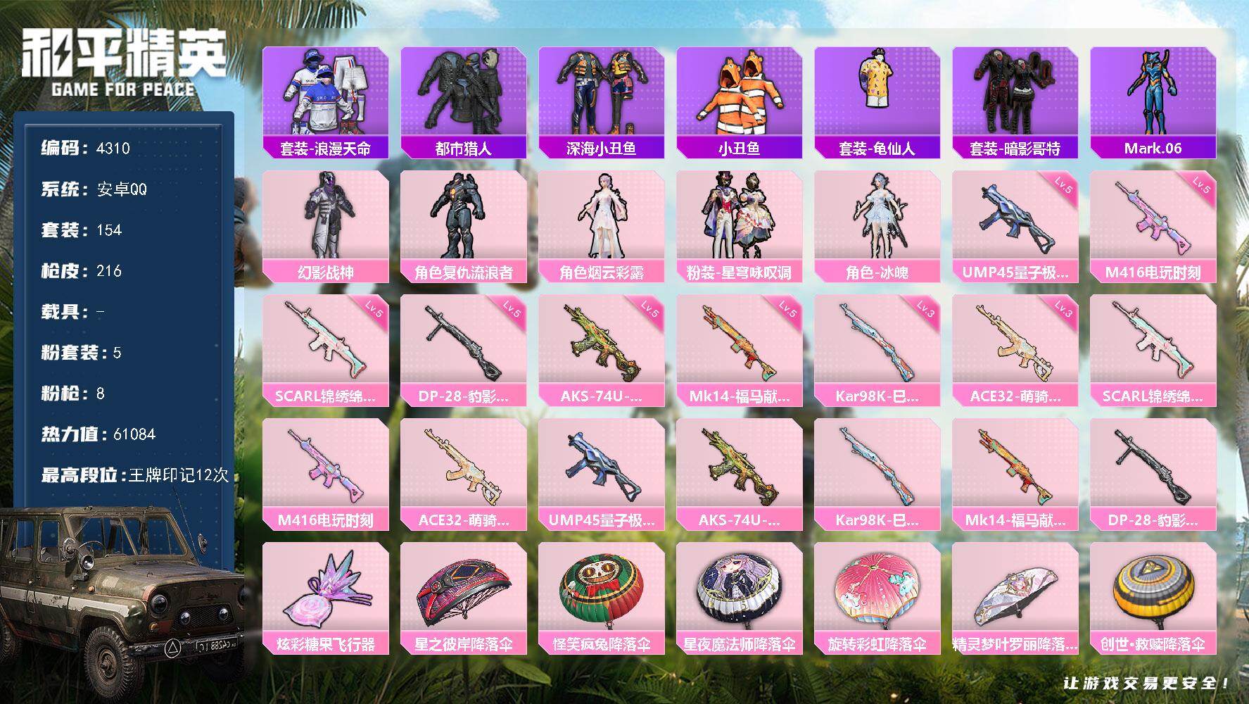 安卓 手Q-5粉装-8特效枪-0载具-1粉色飞行器-61084热力值-12王牌印