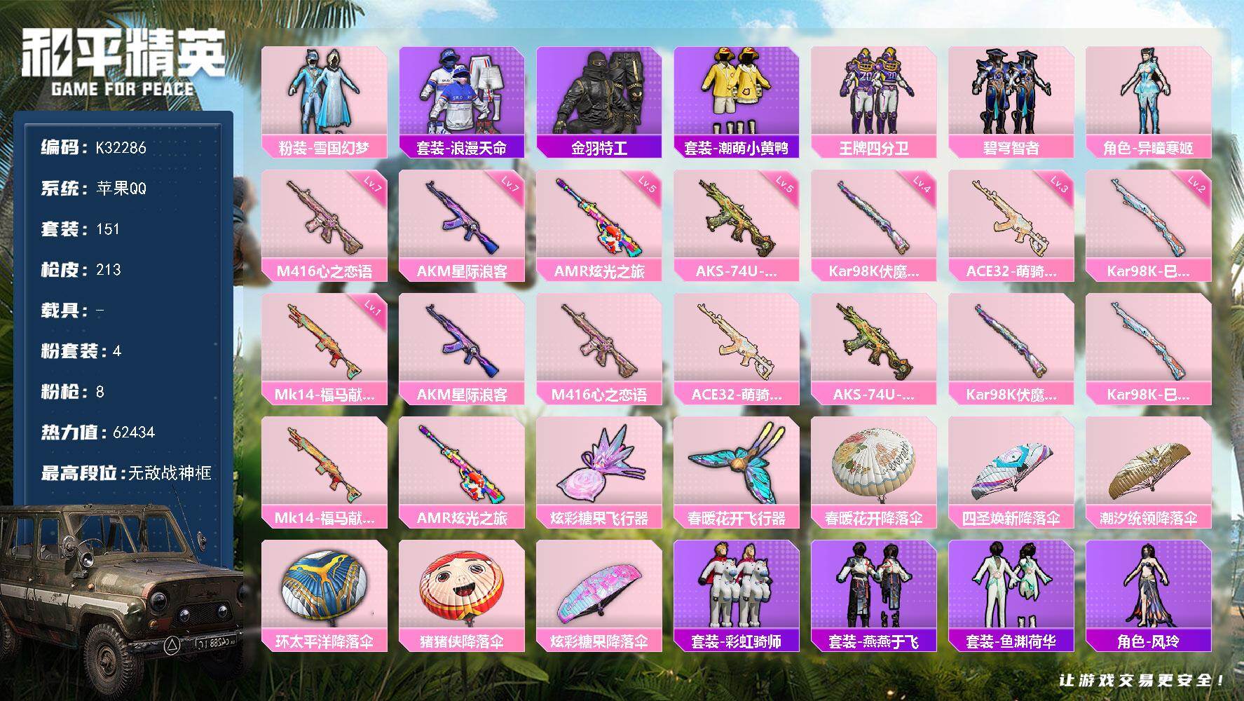 苹果 手Q-1神装-9粉装-8特效枪-7载具-6粉色飞行器-88516热力值-