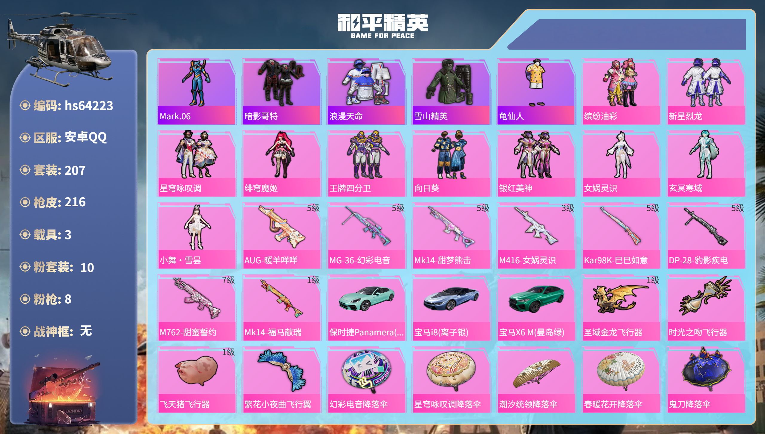 4粉装-6特效枪-0载具-3粉色飞行器-59601热力值-7王牌印记-145套装-193枪皮